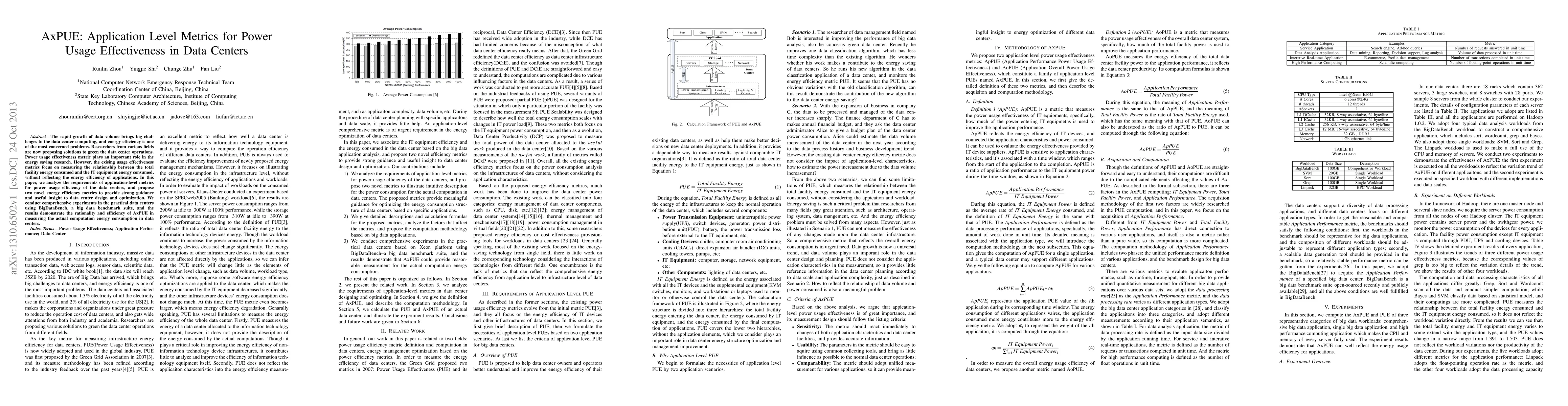 This paper proposes two novel application-level metrics, AxPUE, to measure power usage effectiveness in data centers, addressing the limitations of existing metrics that do not reflect application energy efficiency. Experimental results using BigDataBench show the effectiveness of AxPUE in guiding data center design and optimization.
