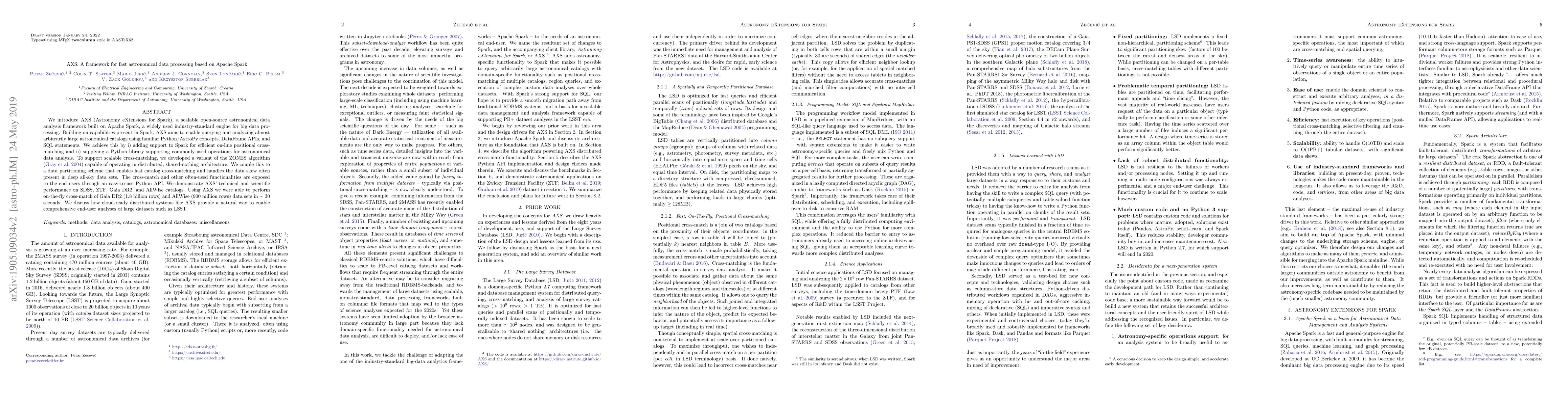 AXS is an open-source framework for fast astronomical data processing using Apache Spark, offering scalable analysis of large catalogs through Python APIs and SQL. It introduces efficient cross-matching and data partitioning techniques, demonstrating rapid performance on major astronomical datasets.