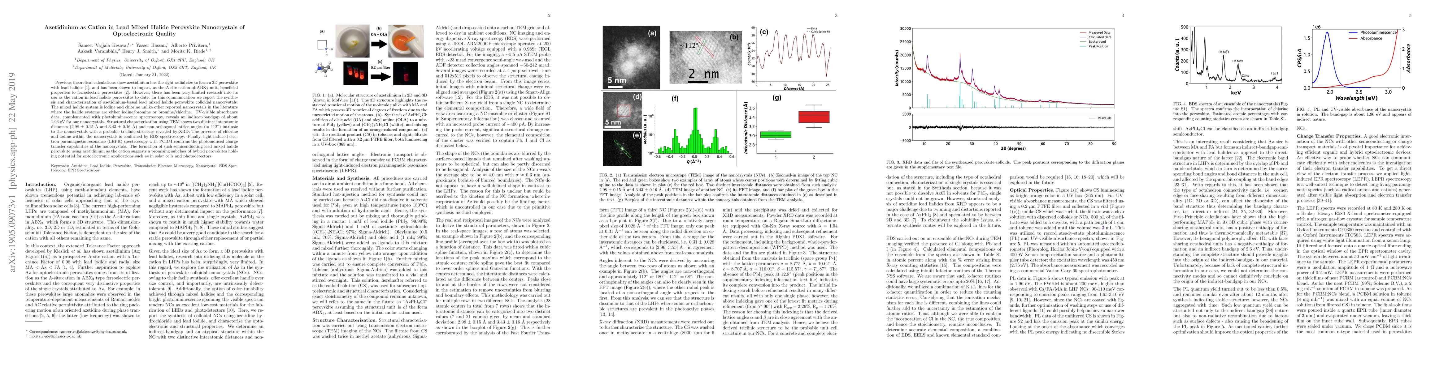 This research reports the synthesis and characterization of azetidinium-based lead mixed halide perovskite nanocrystals using chlorine and iodine. The nanocrystals exhibit an indirect bandgap of 1.96 eV, a probable triclinic structure, and photoinduced charge transfer capabilities, indicating potential for optoelectronic applications.