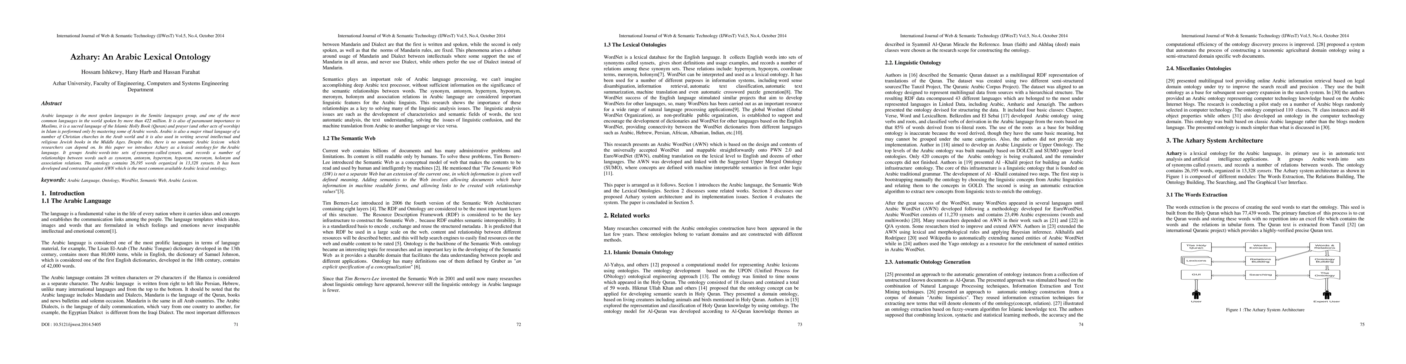 Azhary is a lexical ontology for Arabic that groups words into sets of synonyms, recording relationships between them. It offers a comprehensive semantic resource for the language, contrasting with existing available Arabic lexical ontologies.