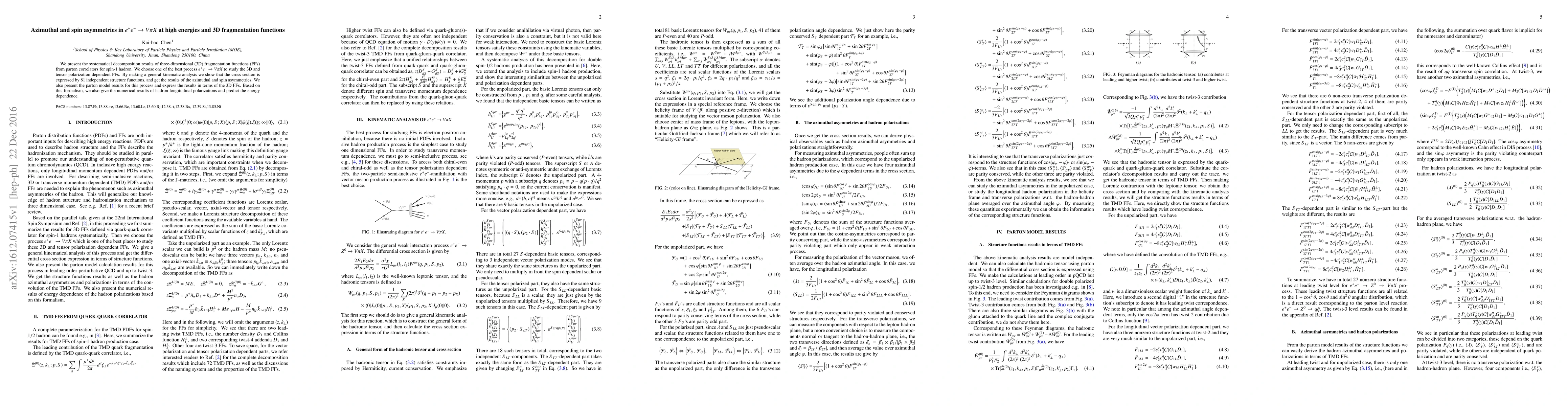 We present the systematical decomposition results of three-dimensional (3D) fragmentation functions (FFs) from parton correlators for spin-1 hadron. We choose one of the best process $e^+e^-\to V\pi X$ to study the 3D and tensor polarization dependent FFs. By making a general kinematic analysis we show that the cross section is expressed by 81 independent structure functions, and get the results of the azimuthal and spin asymmetries. We also present the parton model results for this process and express the results in terms of the 3D FFs. Based on this formalism, we also give the numerical results of hadron longitudinal polarizations and predict the energy dependence.