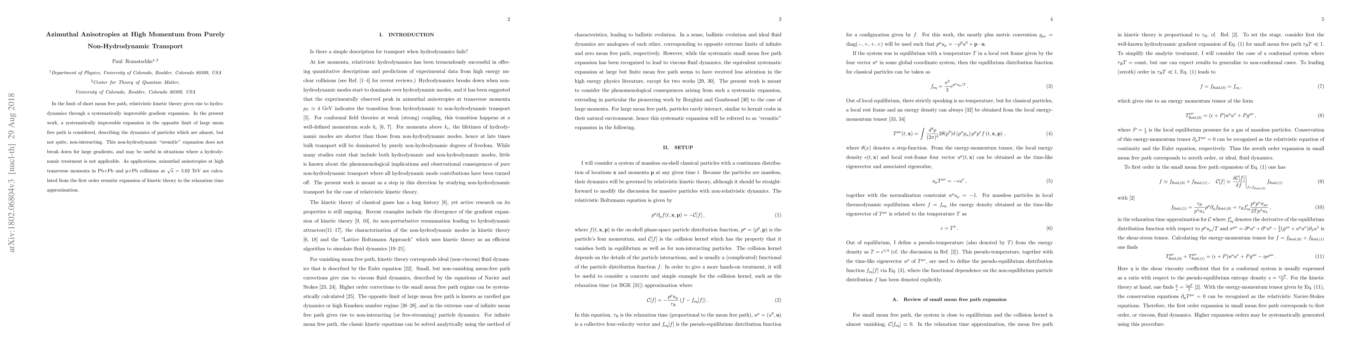 In the limit of short mean free path, relativistic kinetic theory gives rise to hydrodynamics through a systematically improvable gradient expansion. In the present work, a systematically improvable expansion in the opposite limit of large mean free path is considered, describing the dynamics of particles which are almost, but not quite, non-interacting. This non-hydrodynamic "eremitic" expansion does not break down for large gradients, and may be useful in situations where a hydrodynamic treatment is not applicable. As applications, azimuthal anisotropies at high transverse momentum in Pb+Pb and p+Pb collisions at $\sqrt{s}=5.02$ TeV are calculated from the first order eremitic expansion of kinetic theory in the relaxation time approximation.