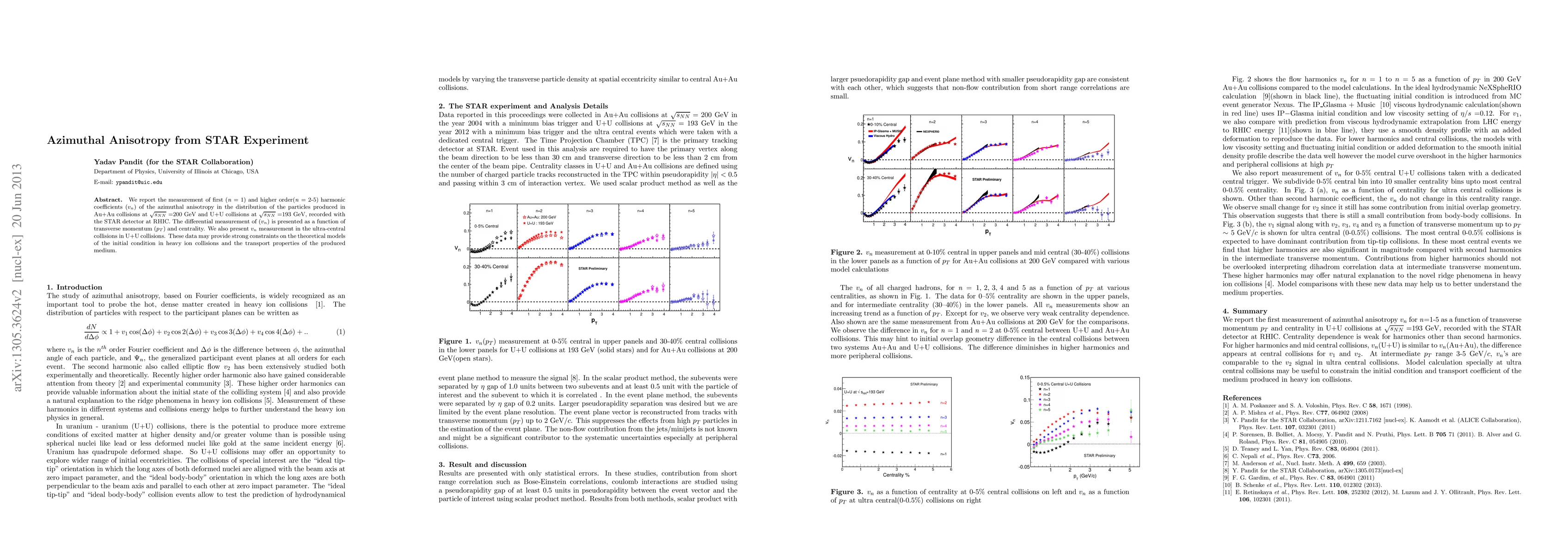 We report the measurement of first (\textit{n} = 1) and higher order(\textit{n} = 2-5) harmonic coefficients ($v_{n}$) of the azimuthal anisotropy in the distribution of the particles produced in Au+Au collisions at $\sqrt{s_{NN}}$ =200 GeV and U+U collisions at $\sqrt{s_{NN}}$ =193 GeV, recorded with the STAR detector at RHIC. The differential measurement of $(v_{n})$ is presented as a function of transverse momentum ($p_{T}$) and centrality. We also present $v_{n}$ measurement in the ultra-central collisions in U+U collisions. These data may provide strong constraints on the theoretical models of the initial condition in heavy ion collisions and the transport properties of the produced medium.