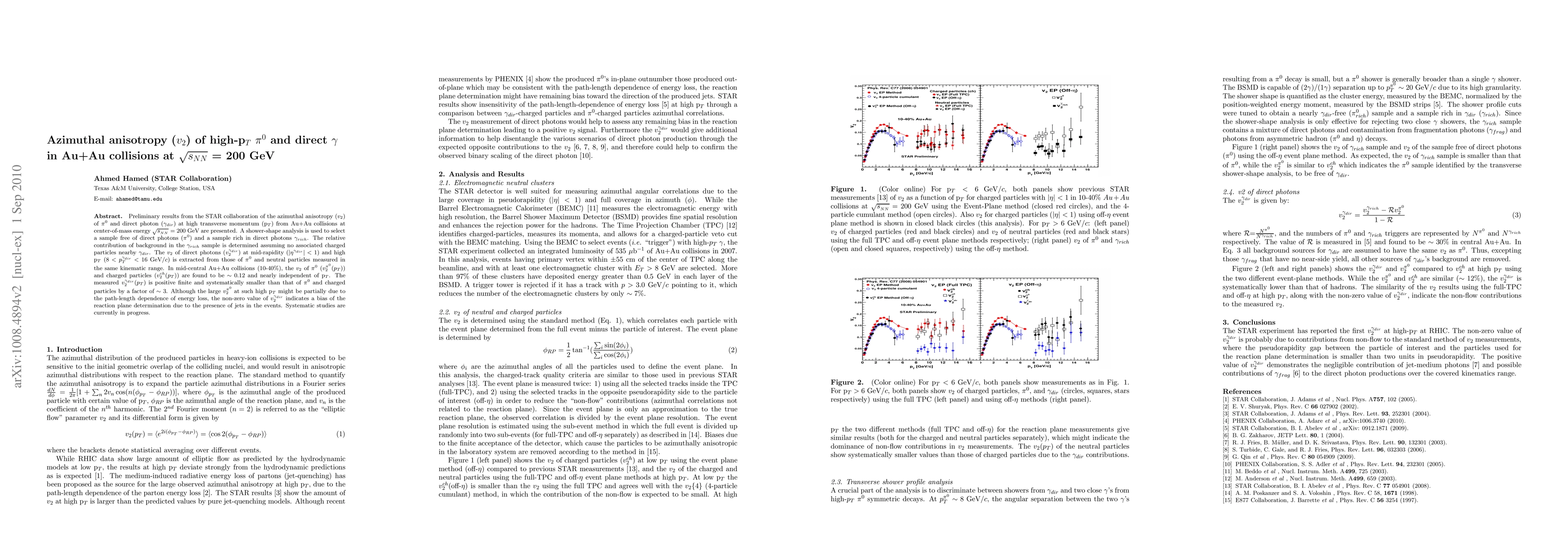 Preliminary results from the STAR collaboration of the azimuthal anisotropy $(v_{2})$ of $\pi^{0}$ and direct photon ($\gamma_{dir}$) at high transverse momentum (p$_{T}$) from Au+Au collisions at center-of-mass energy $\sqrt{s_{_{NN}}}=200$~GeV are presented. A shower-shape analysis is used to select a sample free of direct photons ($\pi^0$) and a sample rich in direct photons $\gamma_{rich}$. The relative contribution of background in the $\gamma_{rich}$ sample is determined assuming no associated charged particles nearby $\gamma_{dir}$. The $v_{2}$ of direct photons ($v_{2}^{\gamma_{dir}}$) at mid-rapidity ($|\eta^{\gamma_{dir}}|<1$) and high p$_{T}$ ($8< p_{T}^{\gamma_{dir}}<16$~GeV/$c$) is extracted from those of $\pi^{0}$ and neutral particles measured in the same kinematic range. In mid-central Au+Au collisions (10-40$\%$), the $v_{2}$ of $\pi^0$ ($v_{2}^{\pi^{0}}(p_{T})$) and charged particles ($v_{2}^{ch}(p_{T})$) are found to be $\sim$ 0.12 and nearly independent of p$_{T}$. The measured $v_{2}^{\gamma_{dir}}(p_{T})$ is positive finite and systematically smaller than that of $\pi^{0}$ and charged particles by a factor of $\sim$ 3. Although the large $v_{2}^{\pi^{0}}$ at such high p$_{T}$ might be partially due to the path-length dependence of energy loss, the non-zero value of $v_{2}^{\gamma_{dir}}$ indicates a bias of the reaction plane determination due to the presence of jets in the events. Systematic studies are currently in progress.