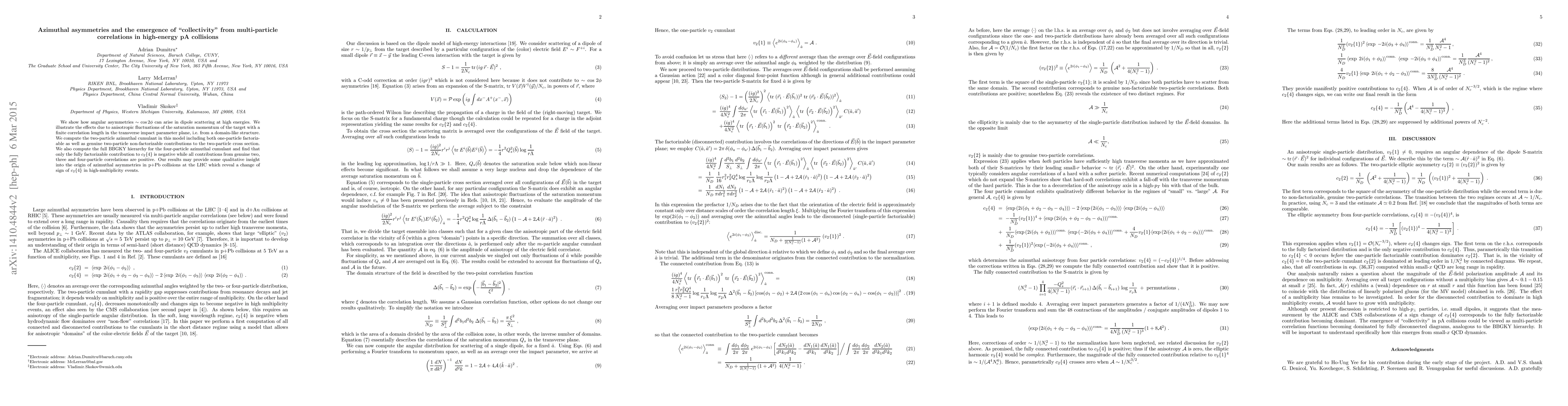 This paper investigates the emergence of azimuthal asymmetries in high-energy proton-nucleus collisions, attributing these asymmetries to anisotropic fluctuations in the target's saturation momentum. It finds that genuine multi-particle correlations contribute positively to these asymmetries, providing insights into the observed "collectivity" in high-multiplicity events at the LHC.
