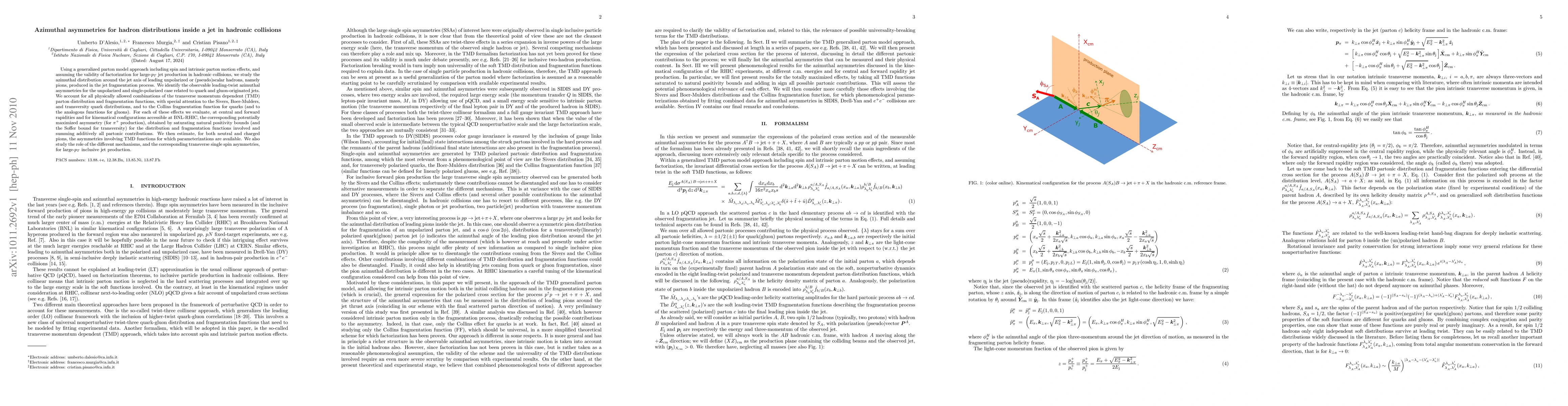 This paper investigates azimuthal asymmetries in the distribution of pions within jets in hadronic collisions, using a generalized parton model that considers spin and intrinsic parton motion. It identifies leading-twist asymmetries for unpolarized and single-polarized hadrons, evaluating the contributions from quark and gluon jets, and estimates the asymmetries for neutral and charged pions using available parameterizations of TMD functions.