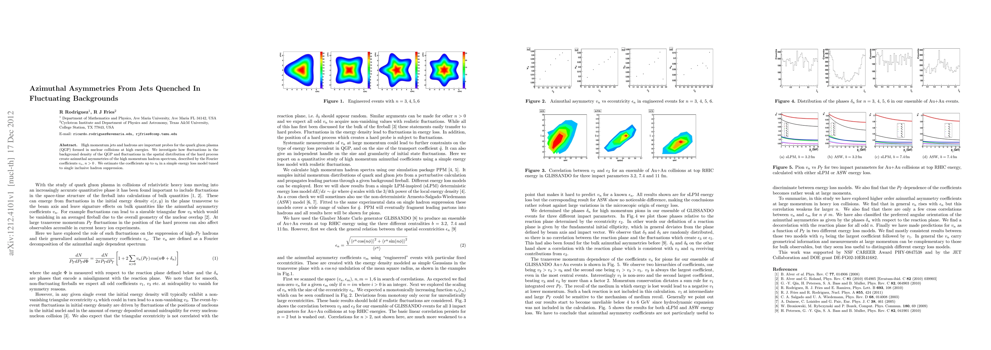 High momentum jets and hadrons are important probes for the quark gluon plasma (QGP) formed in nuclear collisions at high energies. We investigate how fluctuations in the background density of the QGP and fluctuations in the spatial distribution of the hard process create azimuthal asymmetries of the high momentum hadron spectrum, described by the Fourier coefficients $v_n$, $n > 0$ . We estimate the coefficients up to $v_6$ in a simple energy loss model tuned to single inclusive hadron suppression.