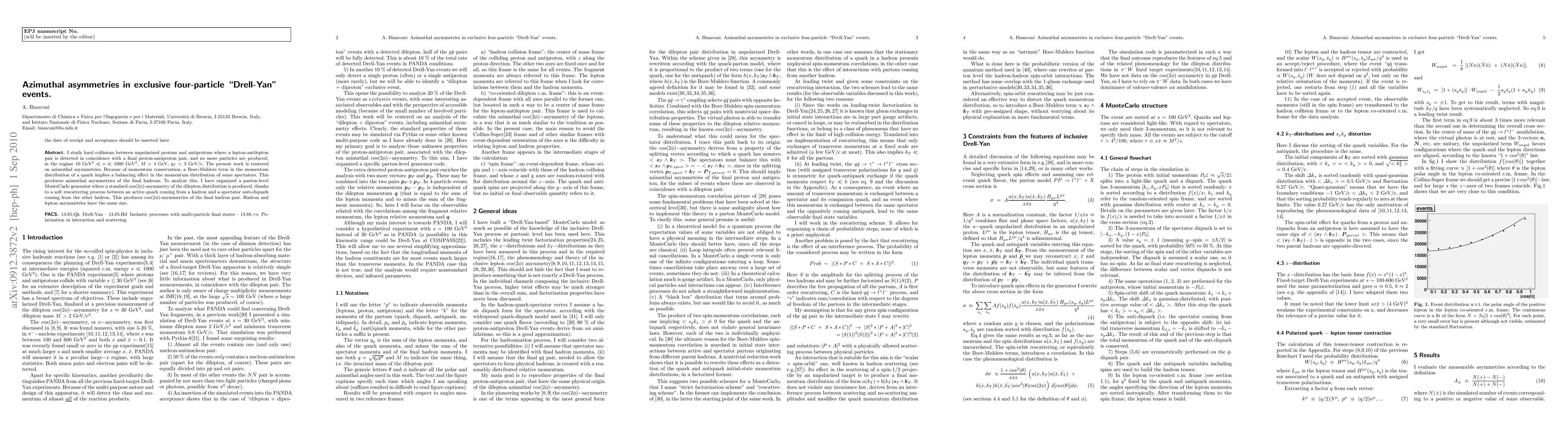 I study hard collisions between unpolarized protons and antiprotons where a lepton-antilepton pair is detected in coincidence with a final proton-antiproton pair, and no more particles are produced, in the regime 10 GeV^2 << s << 1000 GeV^2, M > 4 GeV, q_T < 3 GeV/c. The present work is centered on azimuthal asymmetries. Because of momentum conservation, a Boer-Mulders term in the momentum distribution of a quark implies a balancing effect in the momentum distribution of some spectators. This produces azimuthal asymmetries of the final hadrons. To analyze this, I have organized a parton-level MonteCarlo generator where a standard cos(2phi)-asymmetry of the dilepton distribution is produced, thanks to a soft rescattering process between an active quark coming from a hadron and a spectator anti-diquark coming from the other hadron. This produces cos(2phi)-asymmetries of the final hadron pair. Hadron and lepton asymmetries have the same size.