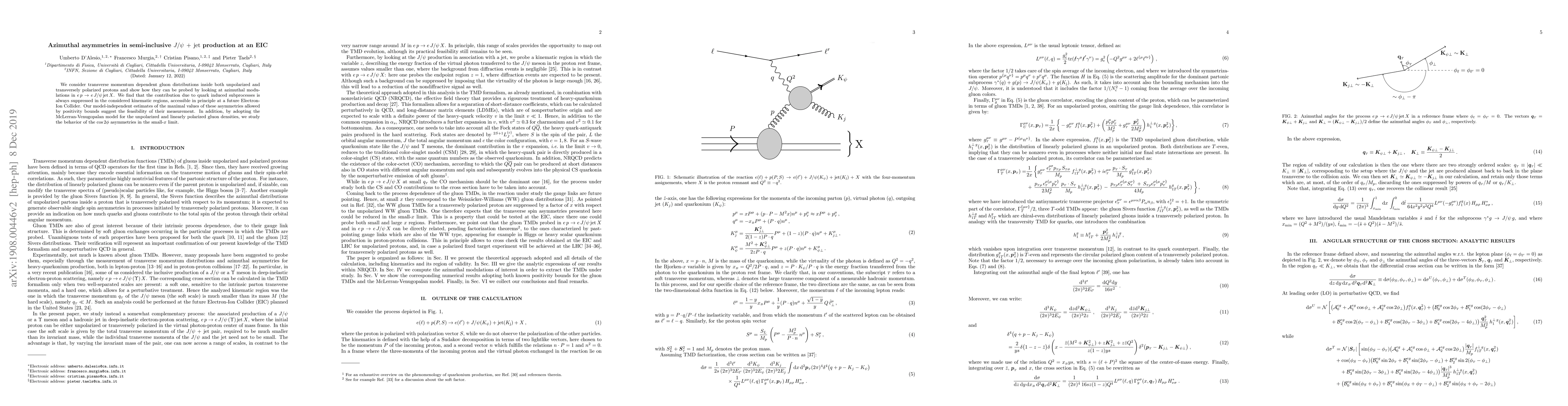 We consider transverse momentum dependent gluon distributions inside both unpolarized and transversely polarized protons and show how they can be probed by looking at azimuthal modulations in $e \, p \to e \, J/\psi \, \mathrm{jet} \, X$. We find that the contribution due to quark induced subprocesses is always suppressed in the considered kinematic regions, accessible in principle at a future Electron-Ion Collider. Our model-independent estimates of the maximal values of these asymmetries allowed by positivity bounds suggest the feasibility of their measurement. In addition, by adopting the McLerran-Venugopalan model for the unpolarized and linearly polarized gluon densities, we study the behavior of the $\cos2\phi$ asymmetries in the small-$x$ limit.