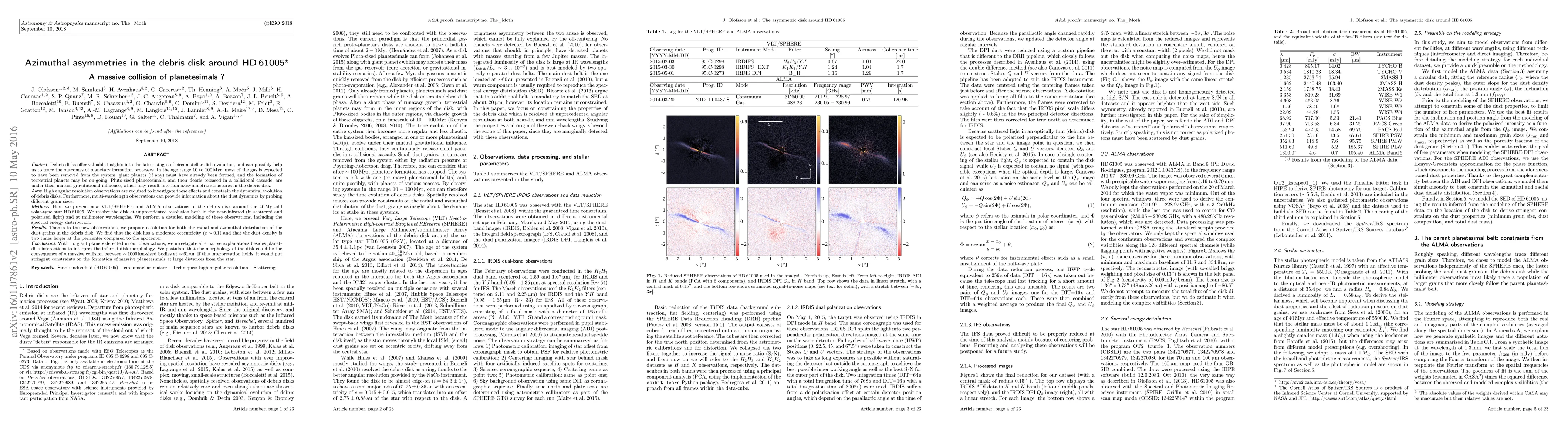 This paper investigates the azimuthal asymmetries in the debris disk around HD61005 using high-resolution VLT/SPHERE and ALMA observations, revealing a moderately eccentric disk with dust density twice as high at the pericenter. The authors suggest that the disk's morphology may result from a massive collision of large bodies, providing constraints on planetesimal formation.