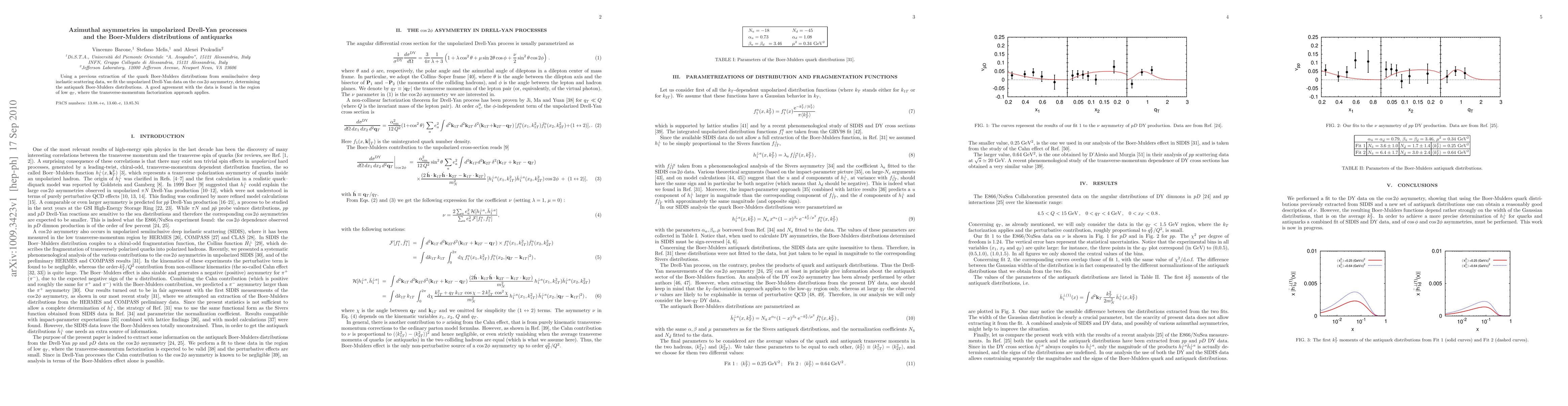 Using a previous extraction of the quark Boer-Mulders distributions from semiinclusive deep inelastic scattering data, we fit the unpolarized Drell-Yan data on the $\cos 2 \phi$ asymmetry, determining the antiquark Boer-Mulders distributions. A good agreement with the data is found in the region of low $q_T$, where the transverse-momentum factorization approach applies.