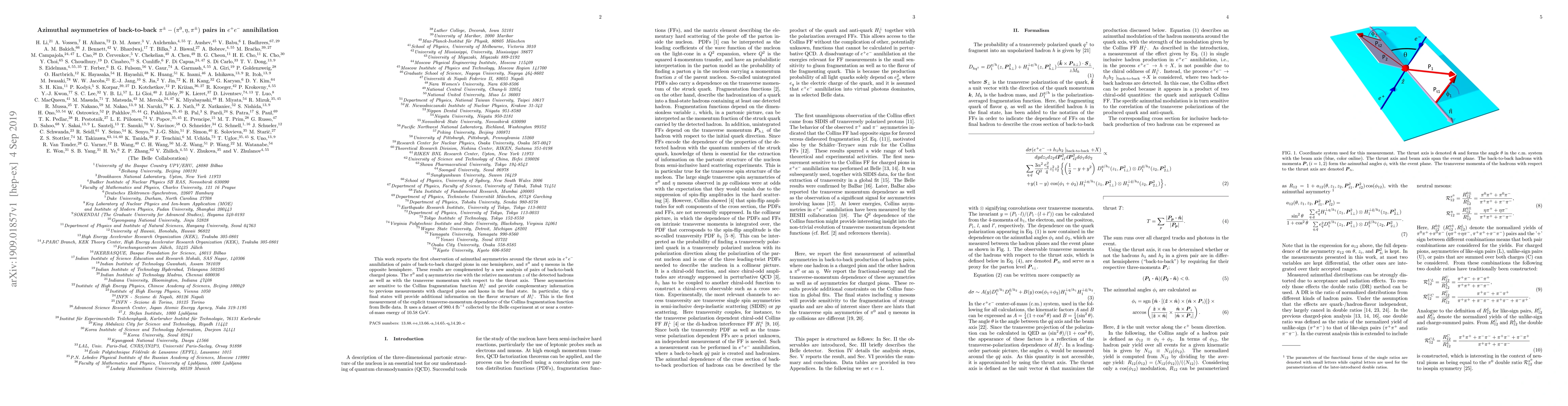 This work reports the first observation of azimuthal asymmetries around the thrust axis in $e^+e^-$ annihilation of pairs of back-to-back charged pions in one hemisphere, and $\pi^0$ and $\eta$ mesons in the opposite hemisphere. These results are complemented by a new analysis of pairs of back-to-back charged pions. The $\pi^0$ and $\eta$ asymmetries rise with the relative momentum $z$ of the detected hadrons as well as with the transverse momentum with respect to the thrust axis. These asymmetries are sensitive to the Collins fragmentation function $H_1^{\perp}$ and provide complementary information to previous measurements with charged pions and kaons in the final state. In particular, the $\eta$ final states will provide additional information on the flavor structure of $H_1^{\perp}$. This is the first measurement of the explicit transverse-momentum dependence of the Collins fragmentation function from Belle data. It uses a dataset of 980.4~fb$^{-1}$ collected by the Belle experiment at or near a center-of-mass energy of 10.58 GeV.