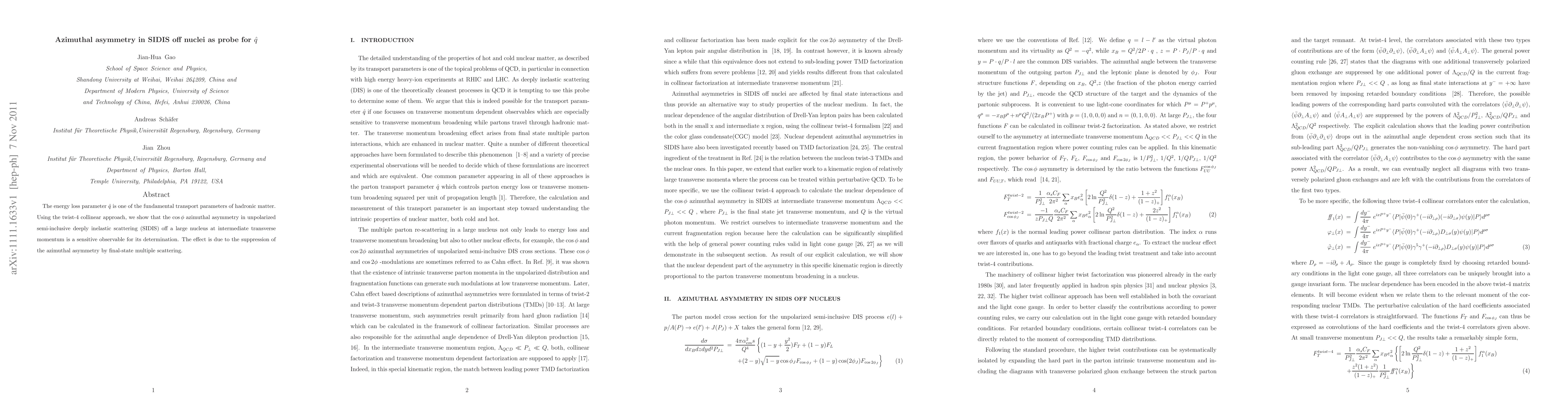 This paper demonstrates that the $\cos \phi$ azimuthal asymmetry in unpolarized semi-inclusive deeply inelastic scattering (SIDIS) off large nuclei can serve as a probe for the energy loss parameter $\hat q$ in hadronic matter, utilizing a twist-4 collinear approach to highlight the suppression effect due to final-state multiple scattering.