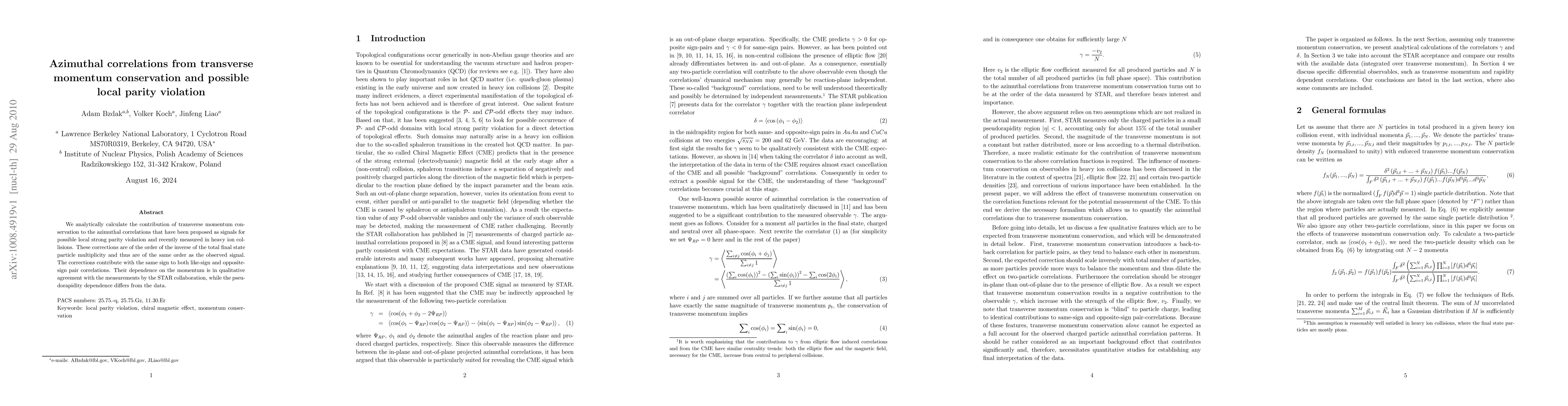 This paper analytically evaluates the impact of transverse momentum conservation on azimuthal correlations in heavy ion collisions, which are proposed as signals for possible local strong parity violation. The calculated corrections, comparable to the observed signal, show qualitative agreement with STAR collaboration's measurements in momentum dependence but differ in pseudorapidity.