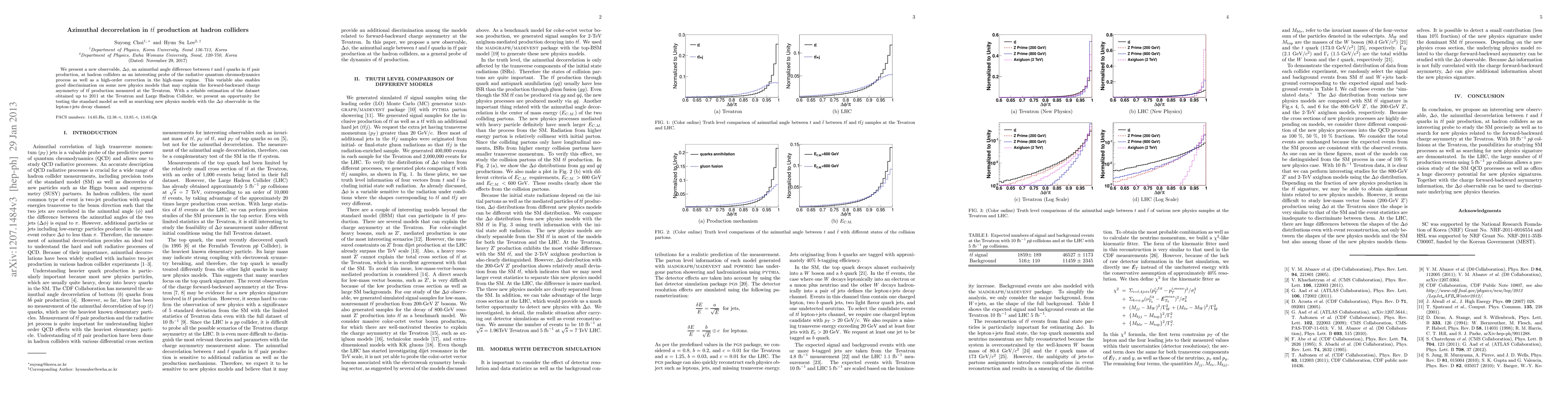This paper introduces $\Delta \phi$, an azimuthal angle difference between $t$ and $\bar{t}$ quarks in $t\bar{t}$ pair production, as a probe for radiative quantum chromodynamics and high-order corrections. It also explores its potential in discriminating new physics models explaining the forward-backward charge asymmetry.
