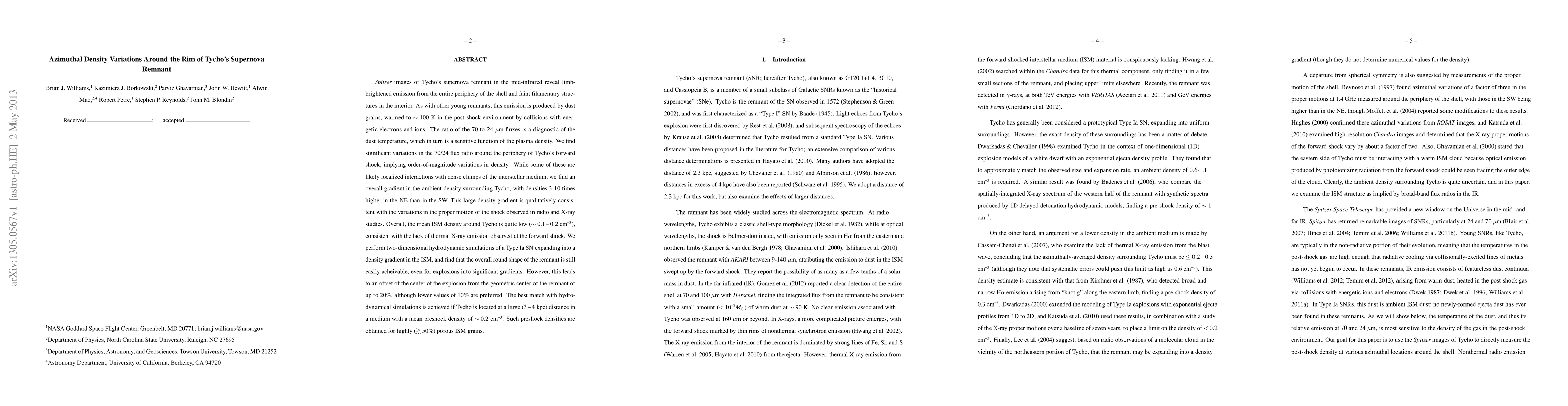 The Spitzer images of Tycho's supernova remnant show significant azimuthal density variations around its rim, with higher densities in the northeast compared to the southwest. Hydrodynamic simulations suggest that the remnant's shape can still be round despite these density gradients, though they cause a 10-20% offset in the explosion center.