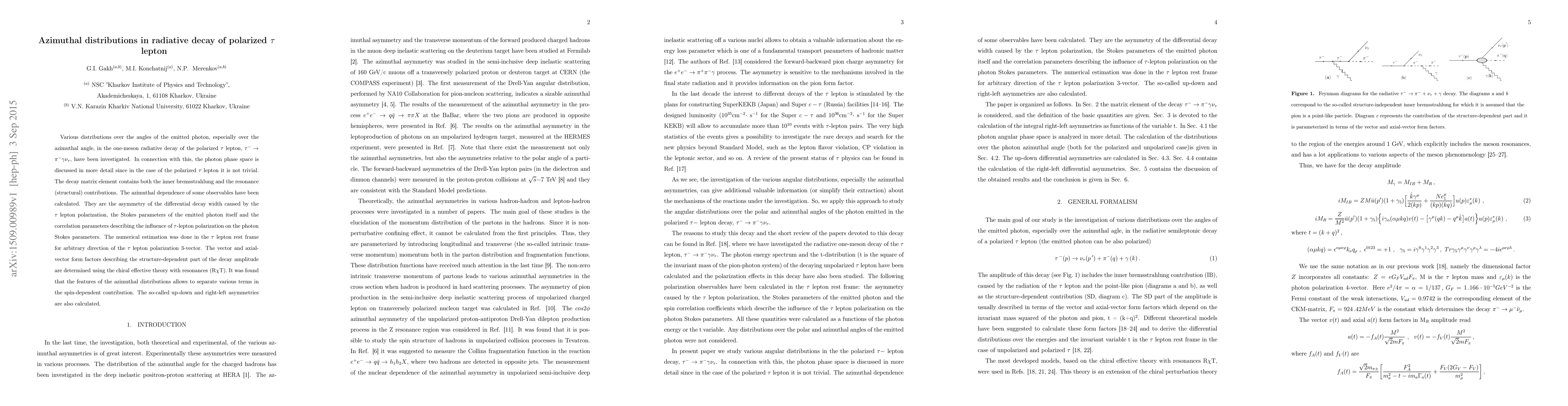 This paper investigates azimuthal distributions in the radiative decay of a polarized $\tau$ lepton, focusing on the decay $\tau^-\to\pi^-\gamma\nu_{\tau}$. It calculates the azimuthal dependence of various observables, including asymmetries and photon Stokes parameters, using chiral effective theory with resonances.