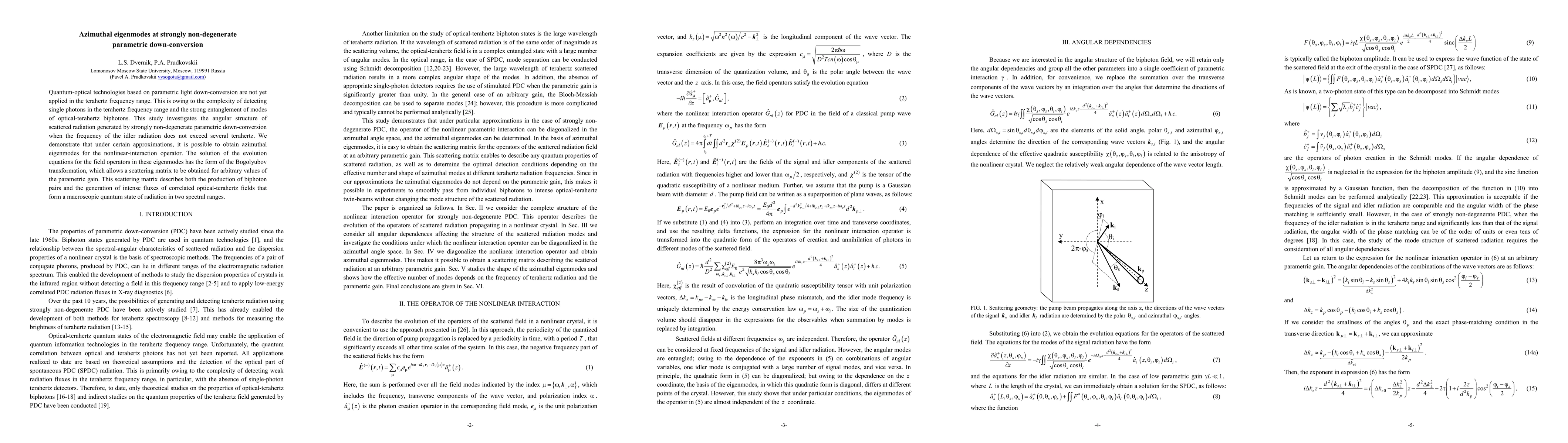 This study explores the angular structure of scattered radiation from strongly non-degenerate parametric down-conversion, focusing on the terahertz frequency range. It demonstrates the possibility of obtaining azimuthal eigenmodes for the nonlinear-interaction operator, leading to a scattering matrix that describes biphoton pair production and intense correlated optical-terahertz fields.
