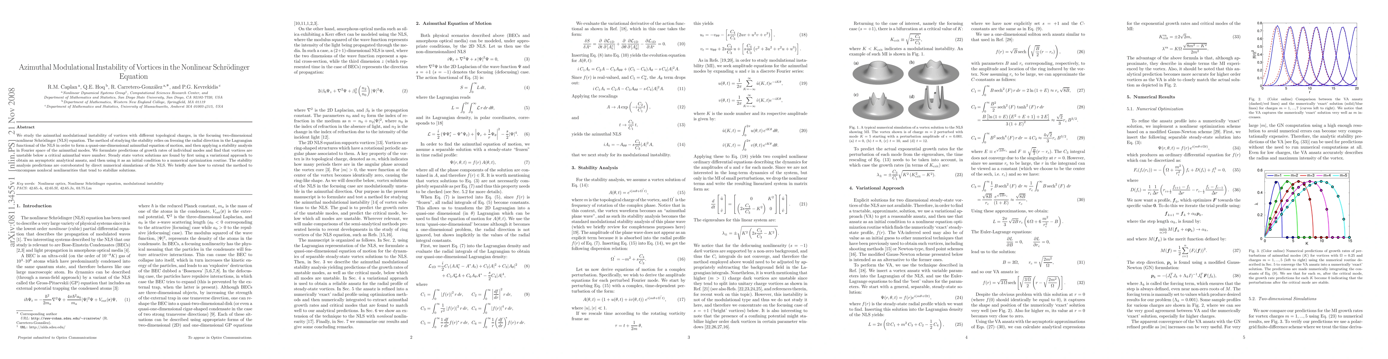 This paper investigates the azimuthal modulational instability of vortices in the focusing two-dimensional nonlinear Schrödinger equation, predicting growth rates of unstable modes and confirming these predictions through numerical simulations. The study also extends the method to account for nonlocal nonlinearities that stabilize solutions.