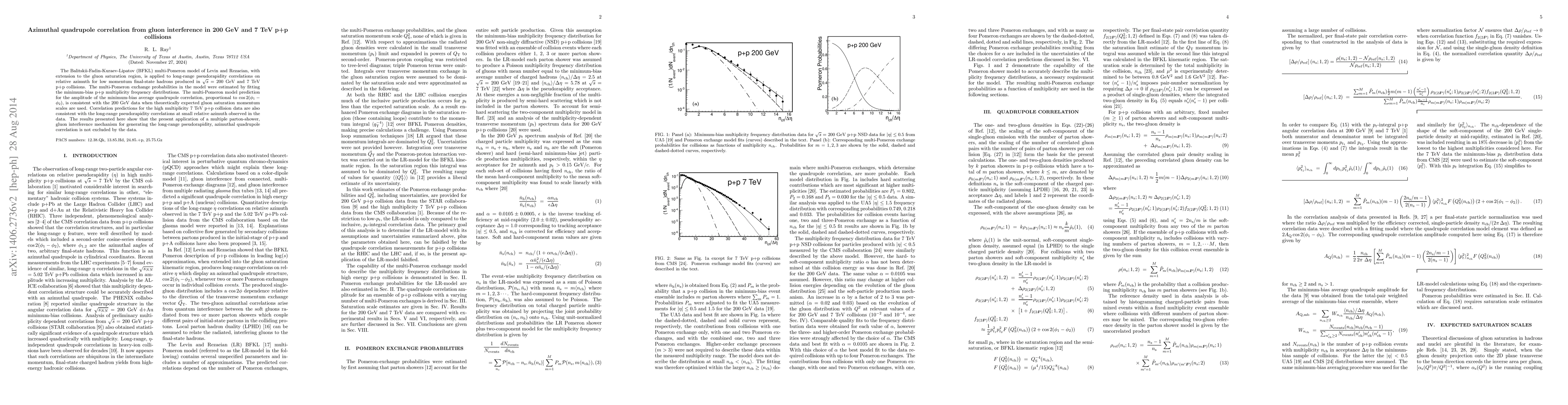 The Balitskii-Fadin-Kuraev-Lipatov (BFKL) multi-Pomeron model of Levin and Rezaeian, with extension to the gluon saturation region, is applied to long-range pseudorapidity correlations on relative azimuth for low momentum final-state hadrons produced in $\sqrt{s}$ = 200~GeV and 7~TeV p+p collisions. The multi-Pomeron exchange probabilities in the model were estimated by fitting the minimum-bias p+p multiplicity frequency distributions. The multi-Pomeron model prediction for the amplitude of the minimum-bias average quadrupole correlation, proportional to $\cos 2(\phi_1 - \phi_2)$, is consistent with the 200~GeV data when theoretically expected gluon saturation momentum scales are used. Correlation predictions for the high multiplicity 7~TeV p+p collision data are also consistent with the long-range pseudorapidity correlations at small relative azimuth observed in the data. The results presented here show that the present application of a multiple parton-shower, gluon interference mechanism for generating the long-range pseudorapidity, azimuthal quadrupole correlation is not excluded by the data.