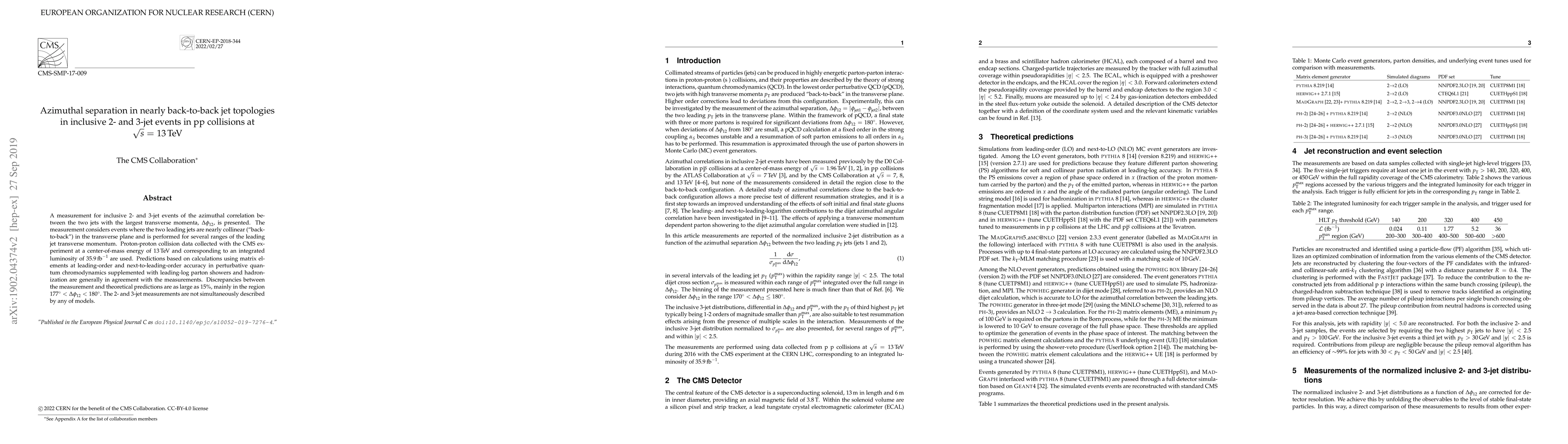 A measurement for inclusive 2- and 3-jet events of the azimuthal correlation between the two jets with the largest transverse momenta, $\Delta\phi_{12}$ , is presented. The measurement considers events where the two leading jets are nearly collinear ("back-to-back") in the transverse plane and is performed for several ranges of the leading jet transverse momentum. Proton-proton collision data collected with the CMS experiment at a center-of-mass energy of 13 TeV and corresponding to an integrated luminosity of 35.9 fb$^{-1}$ are used. Predictions based on calculations using matrix elements at leading-order and next-to-leading-order accuracy in perturbative quantum chromodynamics supplemented with leading-log parton showers and hadronization are generally in agreement with the measurements. Discrepancies between the measurement and theoretical predictions are as large as 15%, mainly in the region 177$^\circ$ $<$ $\Delta\phi_{12}$ $<$ 180$^\circ$. The 2- and 3-jet measurements are not simultaneously described by any of models.
