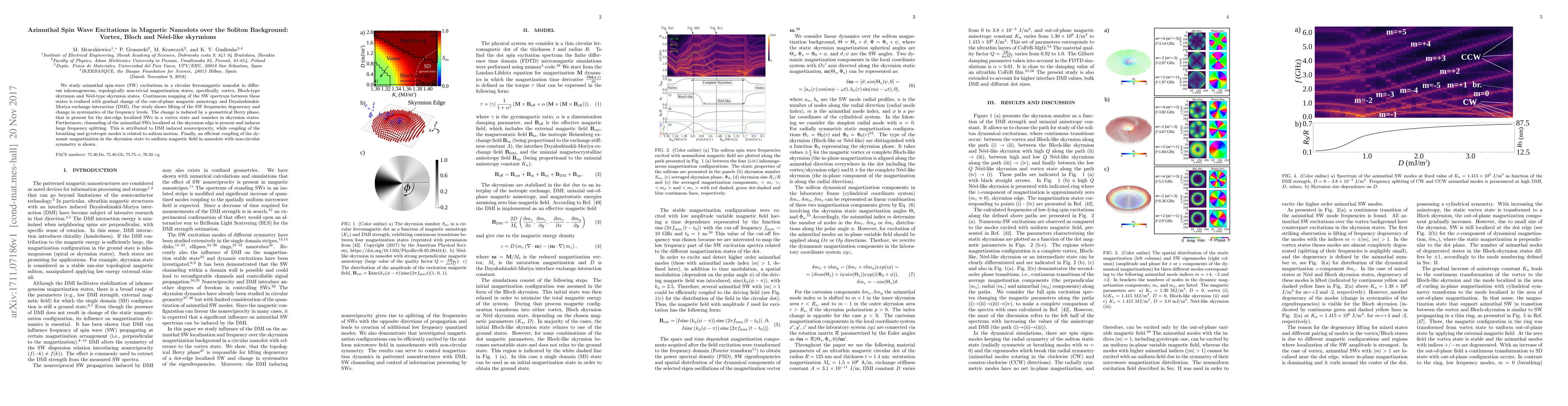 This paper investigates azimuthal spin-wave excitations in ferromagnetic nanodots under vortex, Bloch-type, and Néel-type skyrmion states, revealing changes in spin-wave frequencies due to a geometrical Berry phase and Dzyaloshinskii-Moriya exchange interaction-induced nonreciprocity.