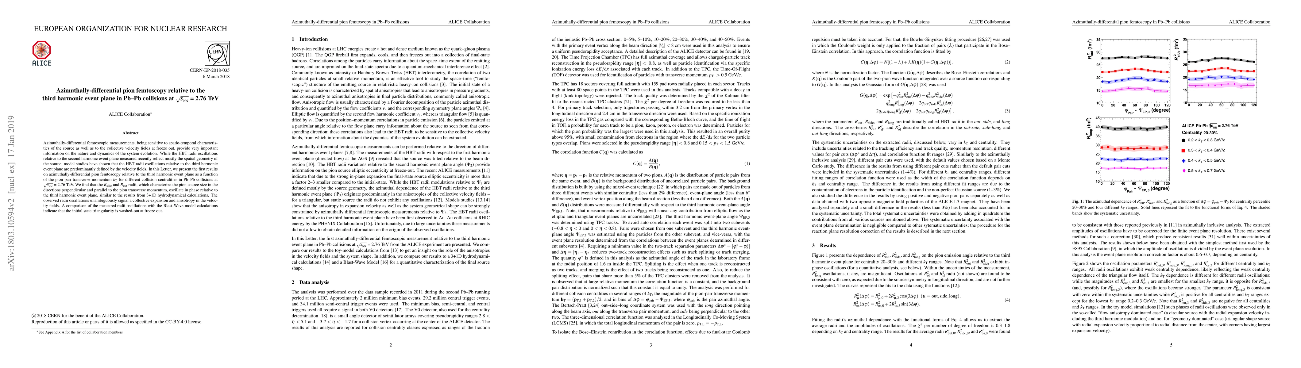 This paper presents the first results on azimuthally-differential pion femtoscopy relative to the third harmonic event plane in Pb-Pb collisions at 2.76 TeV, revealing that the $R_{\rm side}$ and $R_{\rm out}$ radii oscillate in phase, indicating collective expansion and anisotropy in the velocity fields, consistent with hydrodynamical models. The results suggest that initial state triangularity is lost by freeze out.