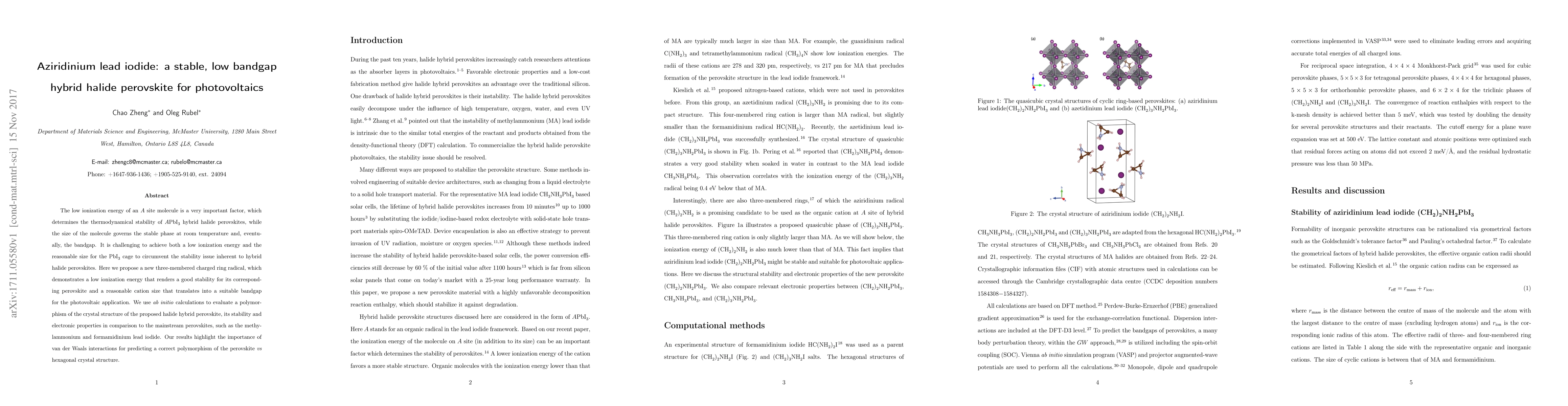 This paper proposes a new aziridinium lead iodide perovskite with a stable low bandgap, addressing stability issues in hybrid halide perovskites. The study uses ab initio calculations to compare its structural, stability, and electronic properties, emphasizing the role of van der Waals interactions in determining polymorphism.