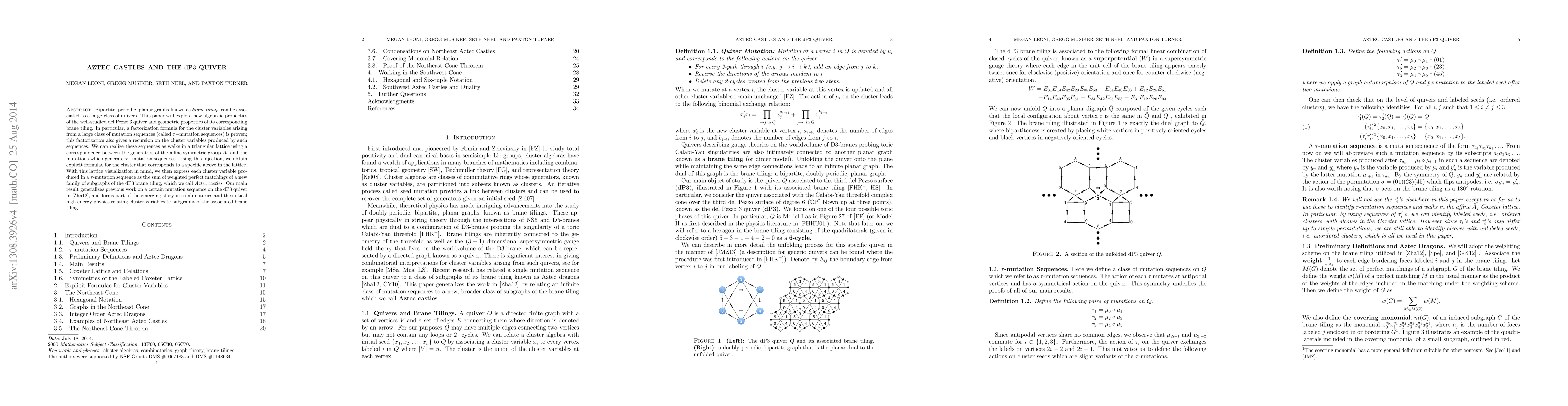 Bipartite, periodic, planar graphs known as brane tilings can be associated to a large class of quivers. This paper will explore new algebraic properties of the well-studied del Pezzo 3 quiver and geometric properties of its corresponding brane tiling. In particular, a factorization formula for the cluster variables arising from a large class of mutation sequences (called $\tau-$mutation sequences) is proven; this factorization also gives a recursion on the cluster variables produced by such sequences. We can realize these sequences as walks in a triangular lattice using a correspondence between the generators of the affine symmetric group $\tilde{A_2}$ and the mutations which generate $\tau-$mutation sequences. Using this bijection, we obtain explicit formulae for the cluster that corresponds to a specific alcove in the lattice. With this lattice visualization in mind, we then express each cluster variable produced in a $\tau$-mutation sequence as the sum of weighted perfect matchings of a new family of subgraphs of the dP3 brane tiling, which we call Aztec castles. Our main result generalizes previous work on a certain mutation sequence on the dP3 quiver in [Zha12], and forms part of the emerging story in combinatorics and theoretical high energy physics relating cluster variables to subgraphs of the associated brane tiling.