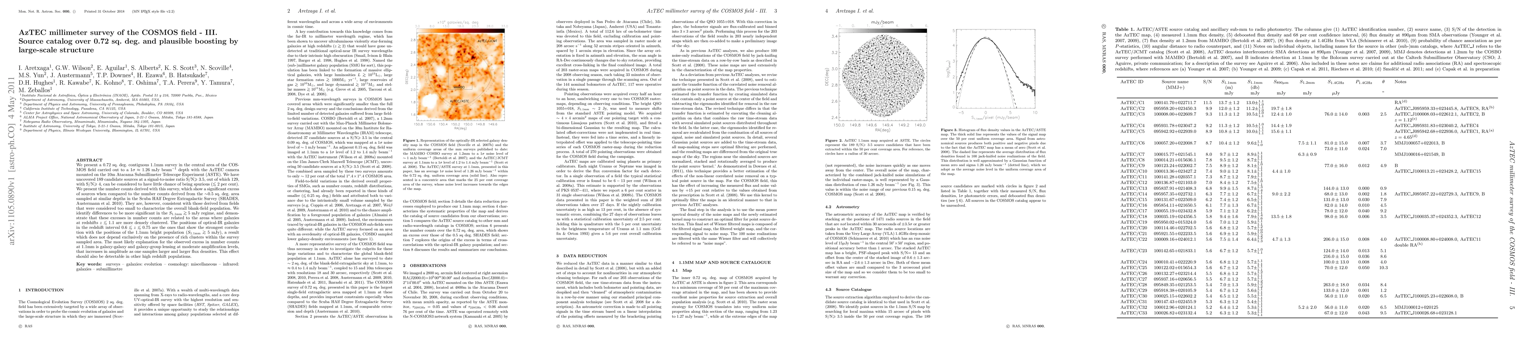 We present a 0.72 sq. deg. contiguous 1.1mm survey in the central area of the COSMOS field carried out to a 1sigma ~ 1.26 mJy/beam depth with the AzTEC camera mounted on the 10m Atacama Submillimeter Telescope Experiment (ASTE). We have uncovered 189 candidate sources at a signal-to-noise ratio S/N >= 3.5, out of which 129, with S/N >= 4, can be considered to have little chance of being spurious (< 2 per cent). We present the number counts derived with this survey, which show a significant excess of sources when compared to the number counts derived from the ~0.5 sq. deg. area sampled at similar depths in the Scuba HAlf Degree Extragalactic Survey (SHADES, Austermann et al. 2010). They are, however, consistent with those derived from fields that were considered too small to characterize the overall blank-field population. We identify differences to be more significant in the S > 5 mJy regime, and demonstrate that these excesses in number counts are related to the areas where galaxies at redshifts z < 1.1 are more densely clustered. The positions of optical-IR galaxies in the redshift interval 0.6 < z < 0.75 are the ones that show the strongest correlation with the positions of the 1.1mm bright population (S > 5 mJy), a result which does not depend exclusively on the presence of rich clusters within the survey sampled area. The most likely explanation for the observed excess in number counts at 1.1mm is galaxy-galaxy and galaxy-group lensing at moderate amplification levels, that increases in amplitude as one samples larger and larger flux densities. This effect should also be detectable in other high redshift populations.