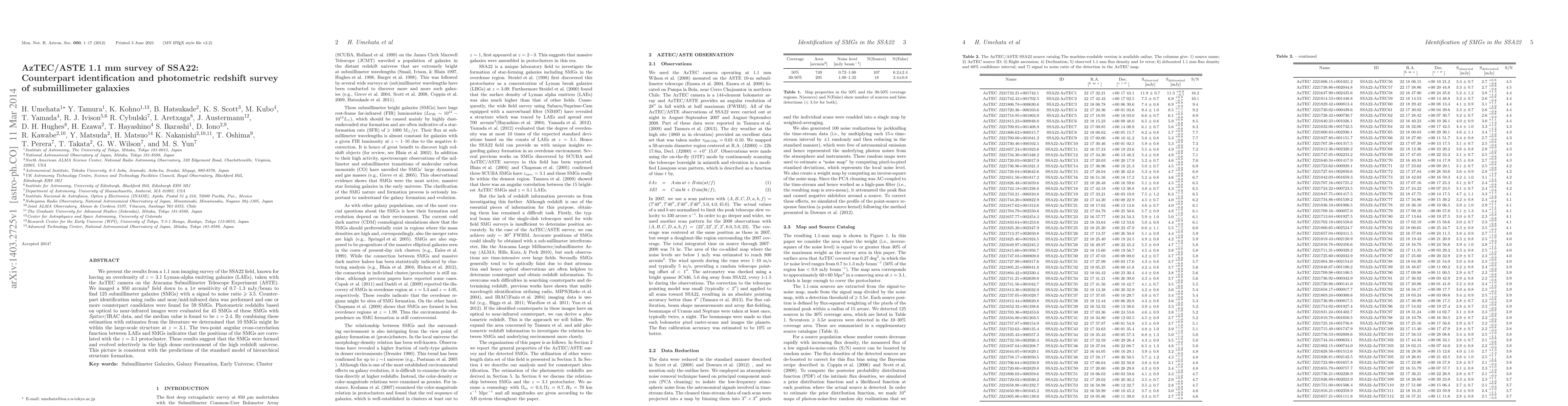 This paper reports on a 1.1 mm survey of the SSA22 field using the AzTEC camera, identifying 125 submillimeter galaxies (SMGs) and correlating them with radio and infrared data. Photometric redshifts suggest a median value of z=2.4 for these SMGs, with some potentially linked to the z=3.1 protocluster, supporting the idea of hierarchical structure formation.