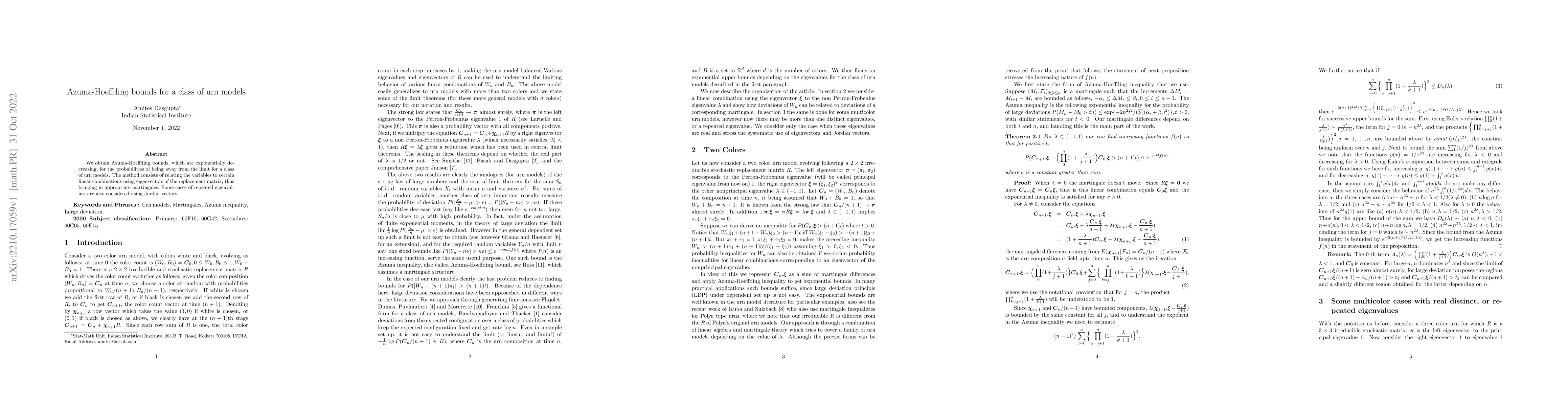 Summary: This paper derives Azuma-Hoeffding bounds for a class of urn models by relating variables to linear combinations via eigenvectors of the replacement matrix, incorporating martingales, and addressing cases of repeated eigenvalues with Jordan vectors.