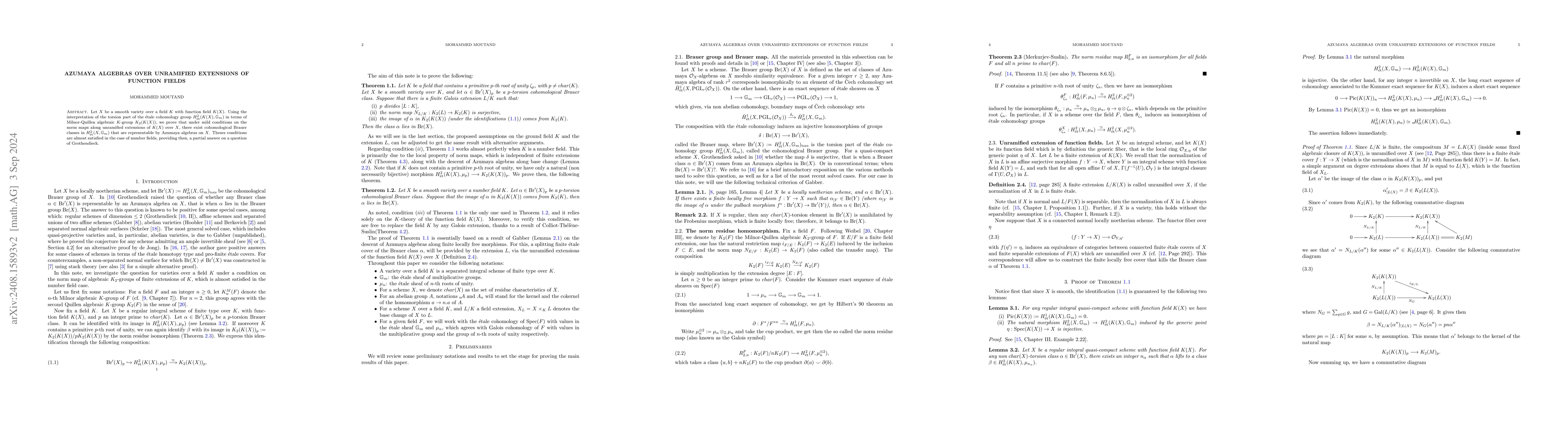 This paper proves that under mild conditions on norm maps in unramified extensions, there exist cohomological Brauer classes in the \'etale cohomology of $X$ representable by Azumaya algebras, addressing a question posed by Grothendieck in the context of number fields.