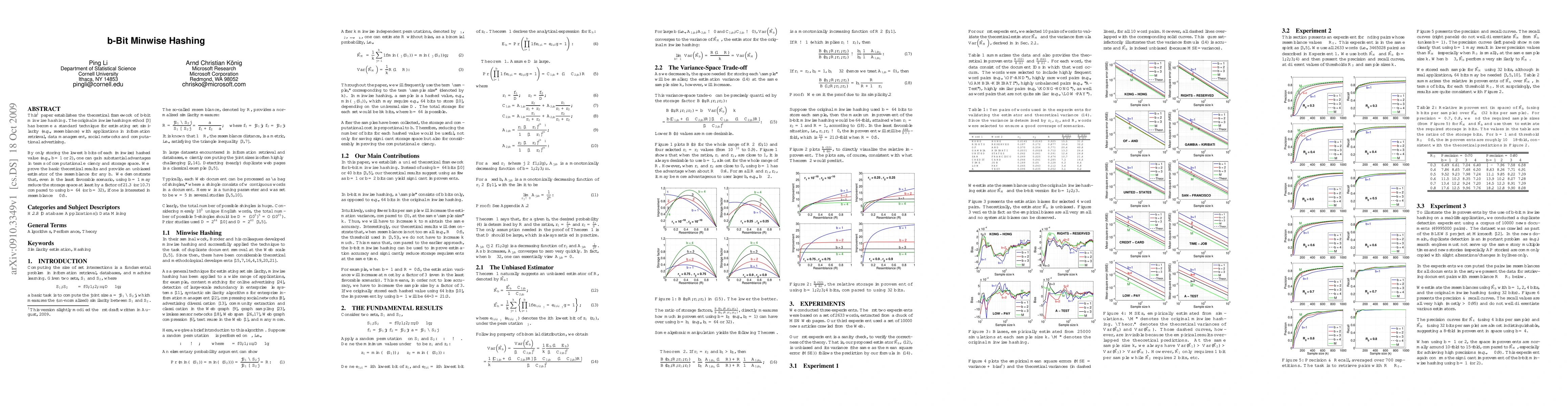 This paper develops the theoretical foundation for b-bit minwise hashing, a method for estimating set similarity with significant computational and storage efficiency gains by storing only the lowest b bits. It provides an unbiased estimator for resemblance and shows that using b=1 can reduce storage space by a factor of 21.3 (or 10.7) compared to b=64 (or b=32) for resemblances greater than 0.5.
