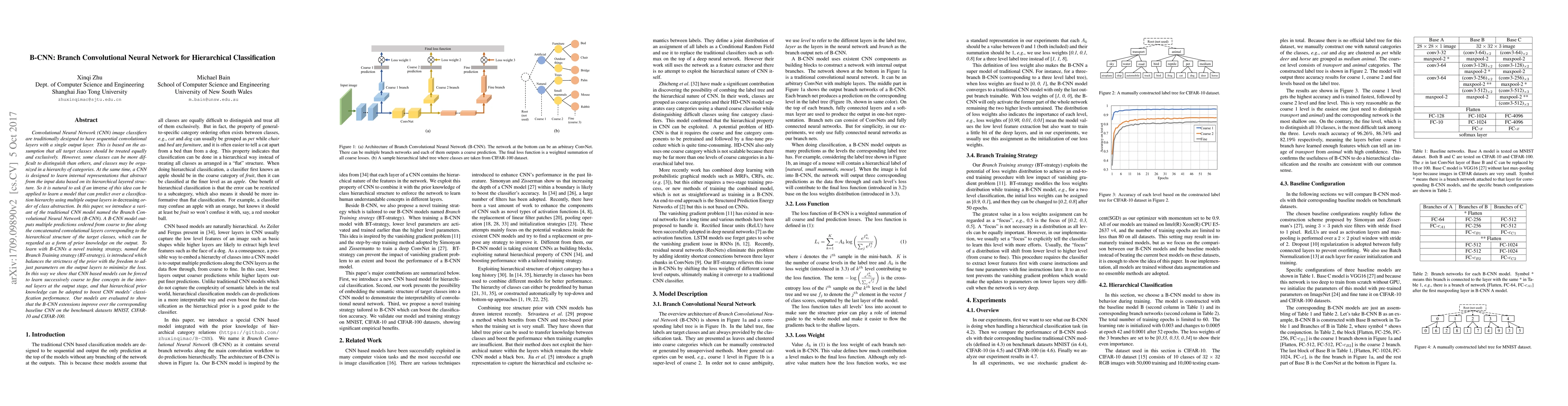 This research introduces a Branch Convolutional Neural Network (B-CNN) designed to handle hierarchical classification tasks by predicting classes in a coarse-to-fine manner, leveraging a hierarchical structure of target classes. The B-CNN model, along with its Branch Training strategy, aims to improve classification performance by incorporating hierarchical prior knowledge, which is shown to outperform traditional CNN models on benchmark datasets.