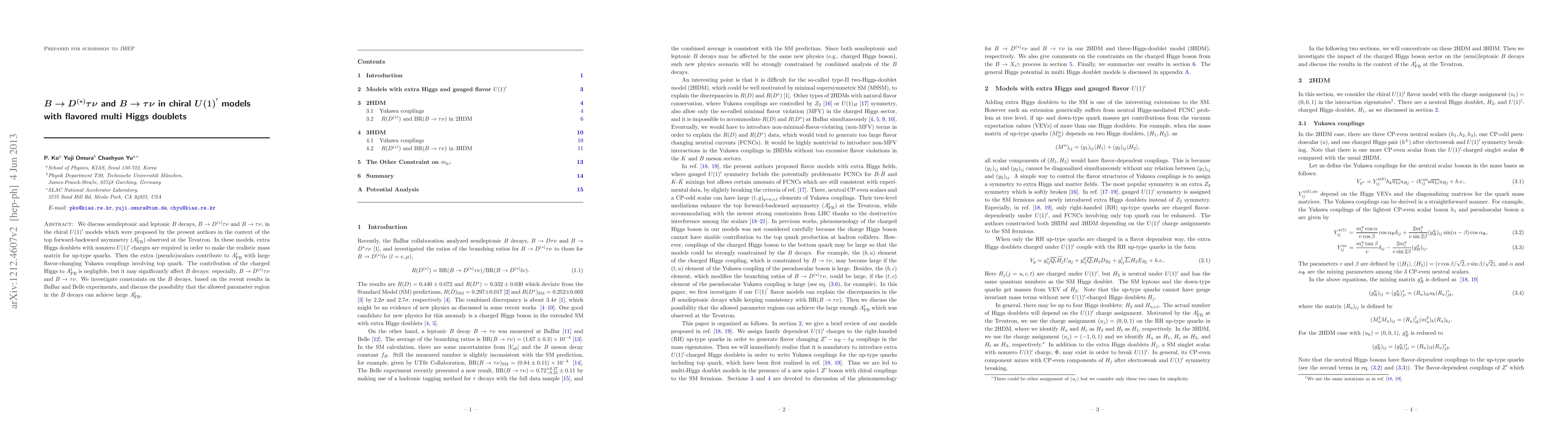 This paper examines semileptonic and leptonic B decays in chiral U(1)' models featuring flavored multi-Higgs doublets, focusing on B to D^{(*)} tau nu and B to tau nu. It explores the implications of these decays in the context of the top forward-backward asymmetry and analyzes constraints based on recent BaBar and Belle experimental results.