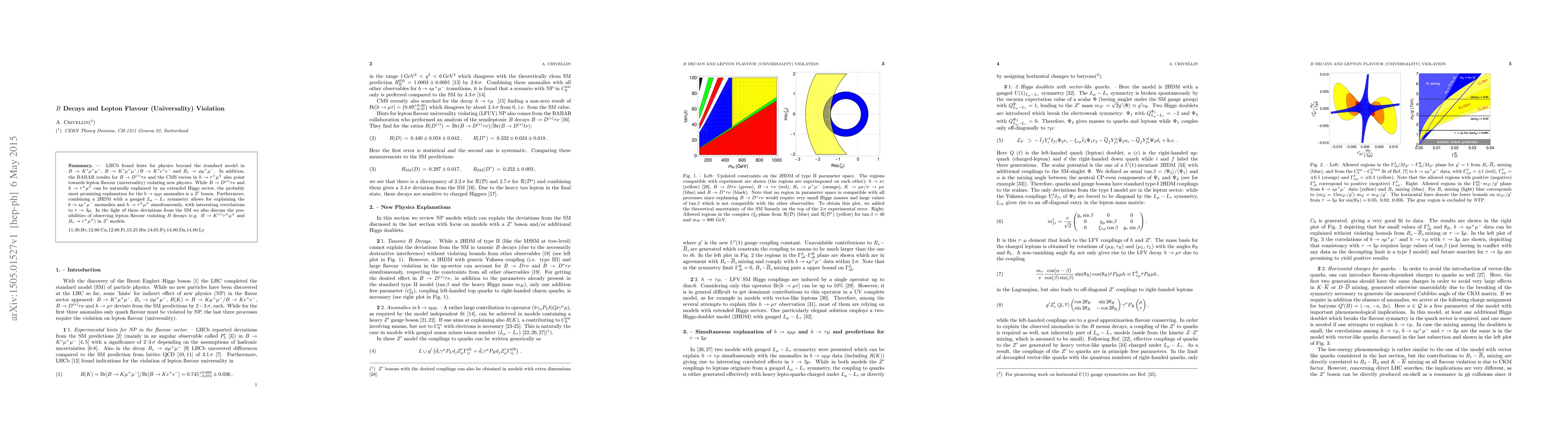 LHCb found hints for physics beyond the standard model in $B\to K^*\mu^+\mu^-$, $B\to K^*\mu^+\mu^-/B\to K^*e^+e^-$ and $B_s\to\phi\mu^+\mu^-$. In addition, the BABAR results for $B\to D^{(*)}\tau\nu$ and the CMS excess in $h\to\tau^\pm\mu^\mp$ also point towards lepton flavour (universality) violating new physics. While $B\to D^{(*)}\tau\nu$ and $h\to\tau^\pm\mu^\mp$ can be naturally explained by an extended Higgs sector, the probably most promising explanation for the $b\to s\mu\mu$ anomalies is a $Z'$ boson. Furthermore, combining a 2HDM with a gauged $L_\mu-L_\tau$ symmetry allows for explaining the $b\to s\mu^+\mu^-$ anomalies and $h\to\tau^\pm\mu^\mp$ simultaneously, with interesting correlations to $\tau\to3\mu$. In the light of these deviations from the SM we also discuss the possibilities of observing lepton flavour violating $B$ decays (e.g. $B\to K^{(*)}\tau^\pm\mu^\mp$ and $B_s\to\tau^\pm\mu^\mp$) in $Z^\prime$ models.