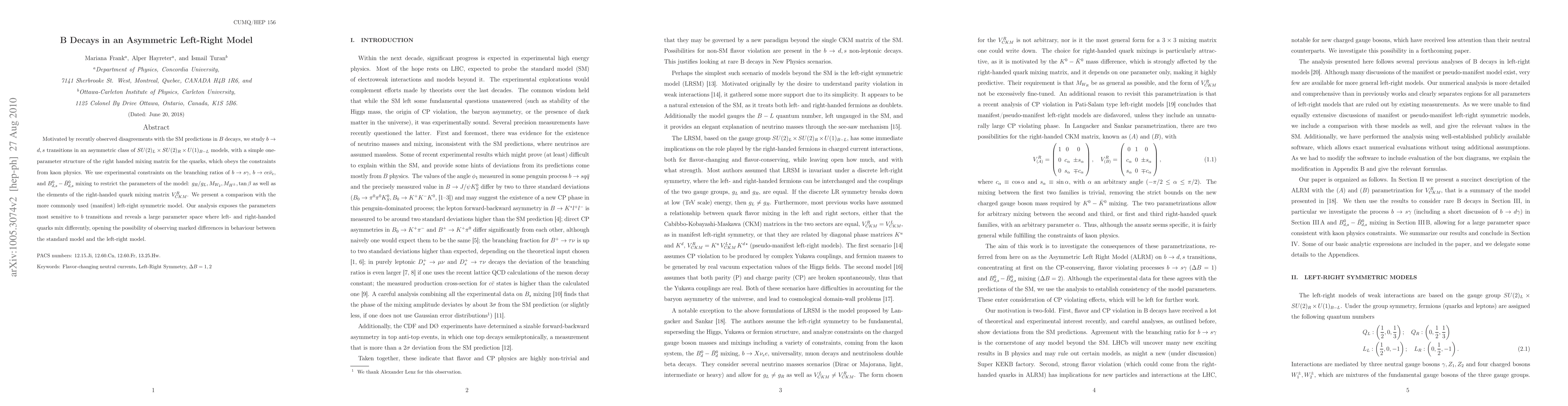 Motivated by recently observed disagreements with the SM predictions in $B$ decays, we study $b \to d, s$ transitions in an asymmetric class of $SU(2)_L \times SU(2)_R \times U(1)_{B-L}$ models, with a simple one-parameter structure of the right handed mixing matrix for the quarks, which obeys the constraints from kaon physics. We use experimental constraints on the branching ratios of $b \to s \gamma$, $b \to c e {\bar \nu}_e$, and $B_{d,s}^0 -\bar{B}^0_{d,s}$ mixing to restrict the parameters of the model: $\displaystyle {g_R}/{g_L}, M_{W_2}, M_{H^\pm}, \tan \beta$ as well as the elements of the right-handed quark mixing matrix $V^R_{CKM}$. We present a comparison with the more commonly used (manifest) left-right symmetric model. Our analysis exposes the parameters most sensitive to $b$ transitions and reveals a large parameter space where left- and right-handed quarks mix differently, opening the possibility of observing marked differences in behaviour between the standard model and the left-right model.