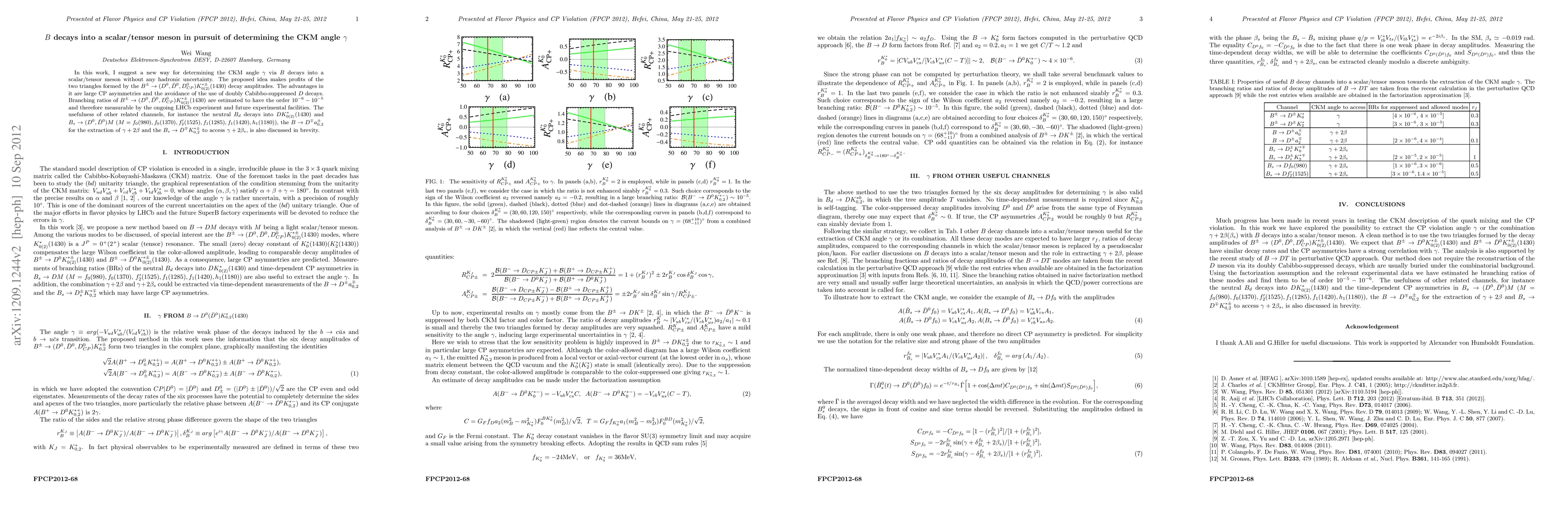 In this work, I suggest a new way for determining the CKM angle $\gamma$ via B decays into a scalar/tensor meson without any hadronic uncertainty. The proposed idea makes profits of the two triangles formed by the $B^\pm\to (D^0,\bar D^0,D_{CP}^0) K^{*\pm}_{0(2)}(1430)$ decay amplitudes. The advantages in it are large CP asymmetries and the avoidance of the use of doubly Cabibbo-suppressed D decays. Branching ratios of $B^\pm\to (D^0,\bar D^0,D_{CP}^0) K^{*\pm}_{0(2)}(1430)$ are estimated to have the order $10^{-6}-10^{-5}$ and therefore measurable by the ongoing LHCb experiment and future experimental facilities. The usefulness of other related channels, for instance the neutral $B_d$ decays into $DK^{*}_{0(2)}(1430)$ and $B_s\to (D^0, \bar D^0) M$ ($M=f_0(980),f_0(1370), f_2'(1525), f_1(1285), f_1(1420), h_1(1180))$, the $B\to D^{\mp} a_{0,2}^{\pm}$ for the extraction of $\gamma+2\beta$ and the $B_s\to D^{\mp} K_{0,2}^{*\pm}$ to access $\gamma+2\beta_s$, is also discussed in brevity.