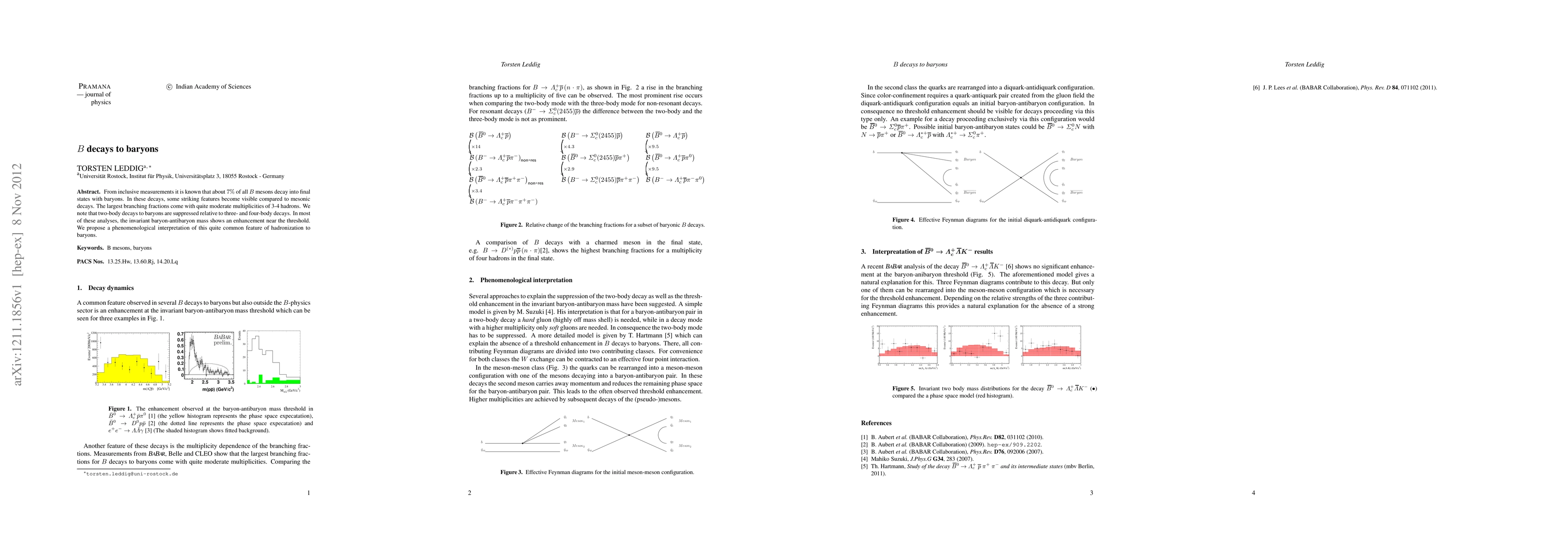 This paper investigates the decay of $B$ mesons into baryonic final states, noting that about 7% of such decays occur with 3-4 hadrons. The study highlights that two-body decays to baryons are less frequent than three- and four-body decays, and proposes a phenomenological explanation for the observed threshold enhancement in the invariant baryon-antibaryon mass.