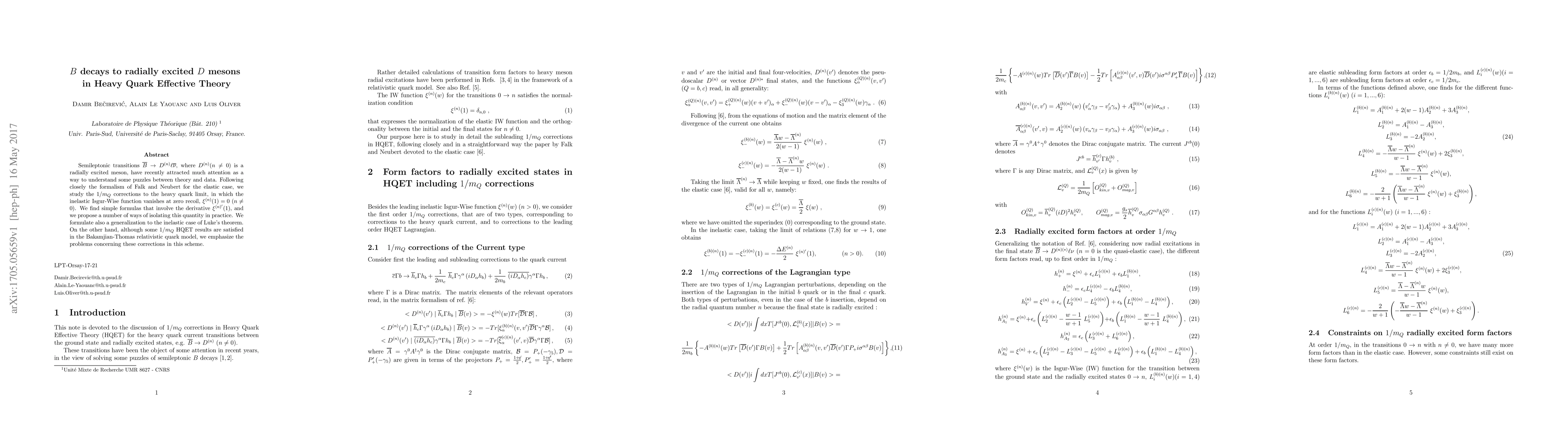 This paper examines $B$ decays to radially excited $D$ mesons using Heavy Quark Effective Theory (HQET). It provides simple formulas for $1/m_Q$ corrections, involving the derivative $xi^{(n)'}(1)$, to understand discrepancies between theory and data. The study also highlights issues with these corrections in the Bakamjian-Thomas relativistic quark model.
