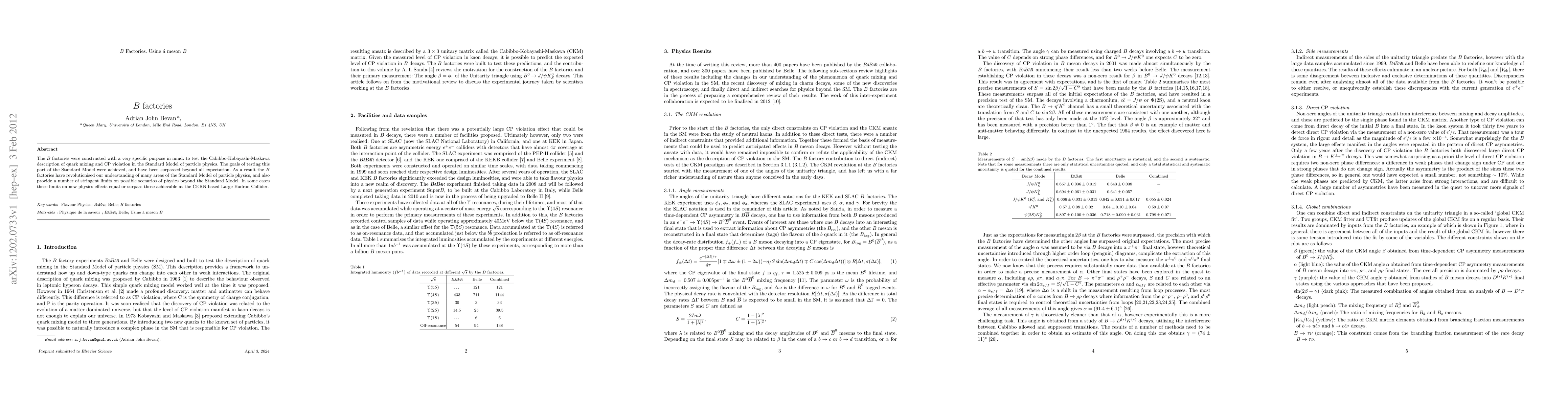 The B factories were built to test quark mixing and CP violation in the Standard Model, achieving and surpassing their goals, thereby revolutionizing our understanding of particle physics and providing stringent limits on physics beyond the Standard Model, sometimes even exceeding those from the Large Hadron Collider.