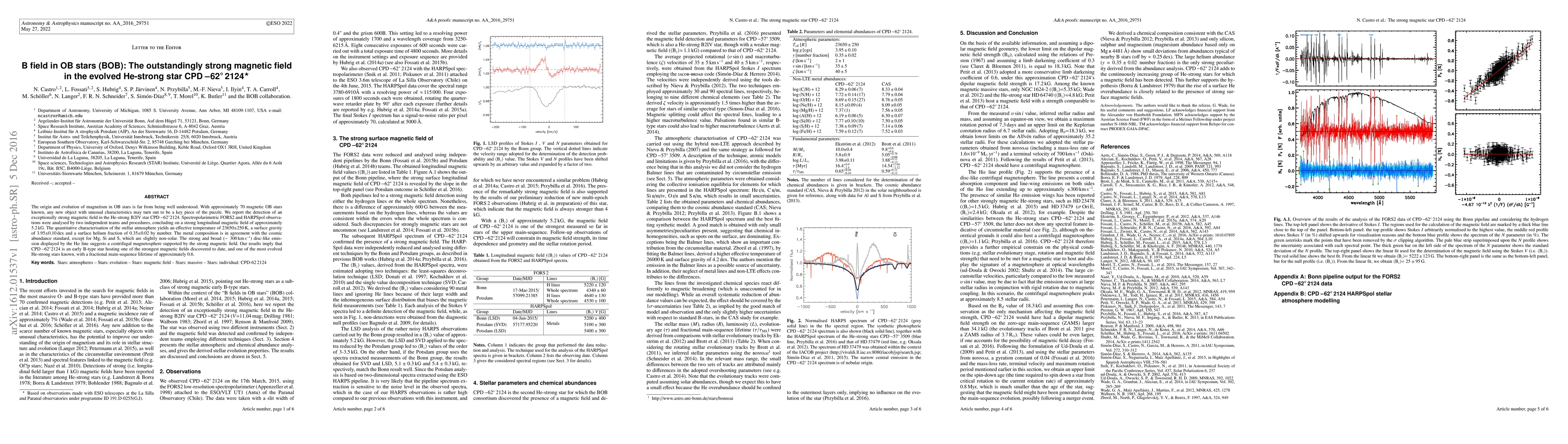 This paper reports the detection of an exceptionally strong magnetic field of approximately 5.2 kG in the evolved He-strong star CPD-62 2124, providing new insights into the magnetism of OB stars. The star's magnetic field supports a centrifugal magnetosphere, suggesting it is one of the most evolved He-strong stars with a fractional main-sequence lifetime of about 0.6.