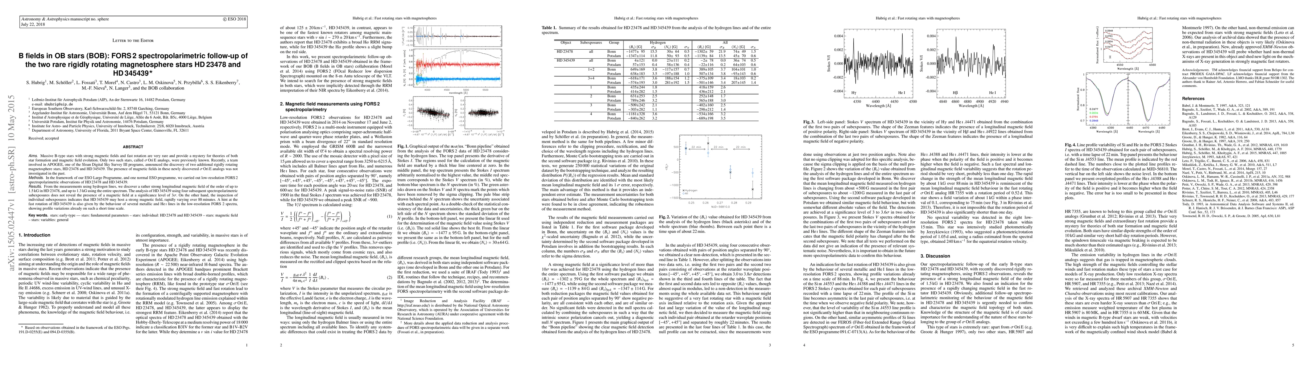 This paper reports on FORS2 spectropolarimetric observations of two rare rigidly rotating magnetosphere stars, HD23478 and HD345439. HD23478 exhibits a strong longitudinal magnetic field up to 1.5kG, while HD345439 shows no significant magnetic field in combined observations but hints at a rapidly varying field in individual subexposures.