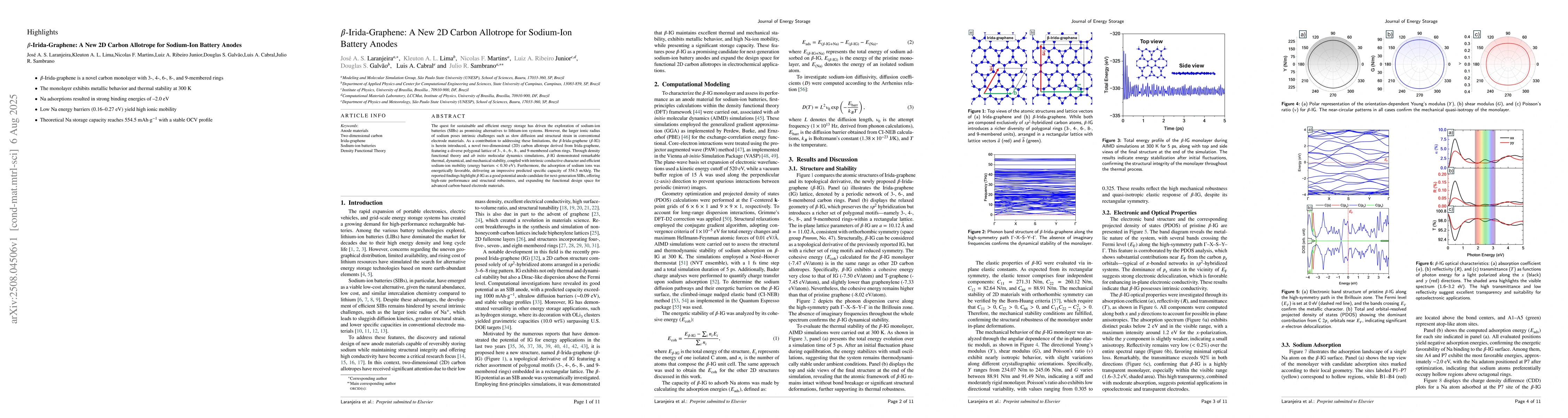 The research introduces u201cetau201d-Irida-graphene (u201cu2113u201d-IG), a novel 2D carbon allotrope for sodium-ion battery anodes. Through simulations, u2113u201d-IG shows excellent stability, conductivity, and efficient sodium-ion mobility, predicting a high specific capacity of 554.5 mAh/g, positioning it as a promising candidate for next-gen SIBs.