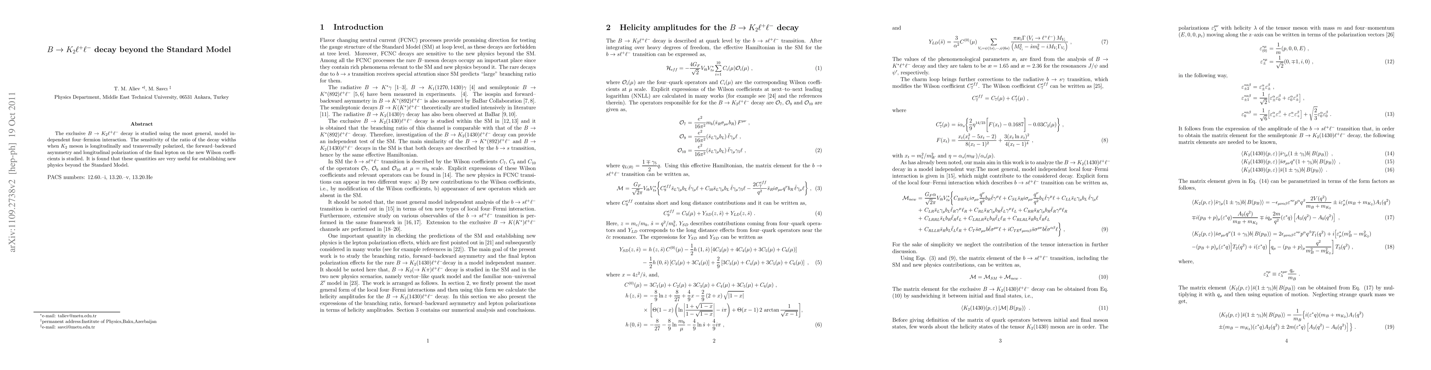This paper investigates the (B -> K_2 l^+ l^-) decay using a general four-fermion interaction framework, revealing that the decay width ratio, forward-backward asymmetry, and final lepton polarization are sensitive to new Wilson coefficients, indicating potential new physics beyond the Standard Model.