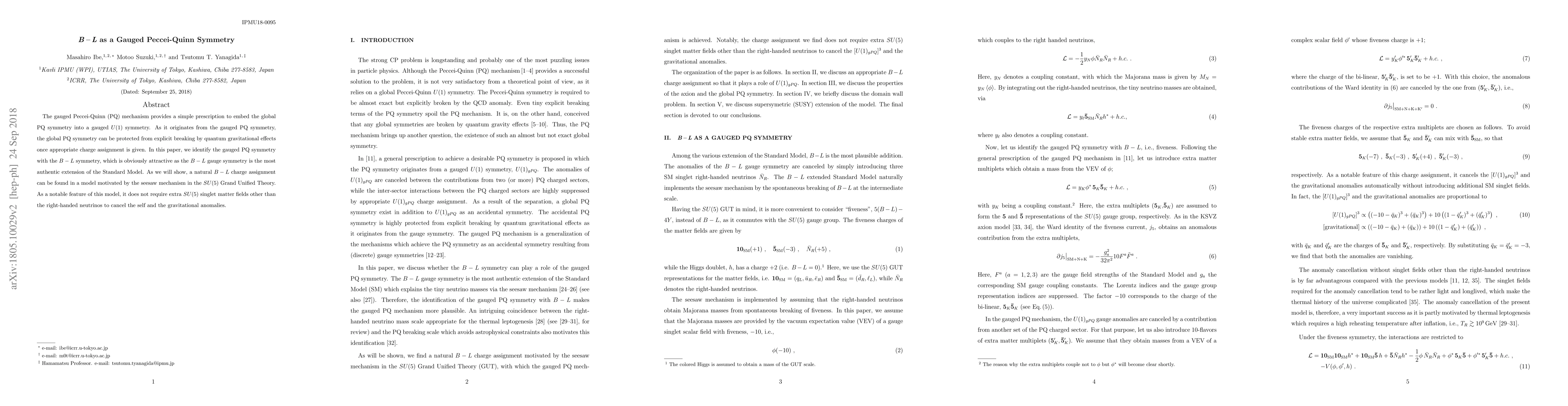 This paper explores embedding the Peccei-Quinn symmetry into a gauged $U(1)$ symmetry through the $B-L$ gauge symmetry, demonstrating its protection from quantum gravitational effects. The proposed model within an $SU(5)$ Grand Unified Theory utilizes right-handed neutrinos to cancel anomalies without needing additional singlet matter fields.