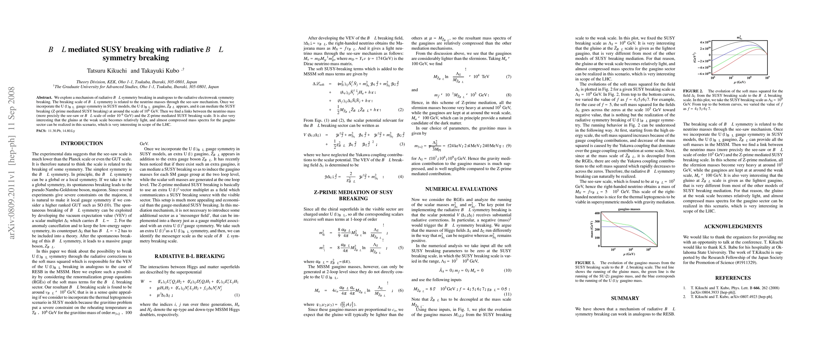 This paper investigates a mechanism for radiative breaking of B-L symmetry in supersymmetric models, linking it to the see-saw mechanism for neutrino masses. The study finds that the Z-prime gaugino from U(1)B-L gauge symmetry can mediate SUSY breaking at around 10^6 GeV, leading to compressed gaugino masses and relatively light gluinos, which is significant for LHC phenomenology.