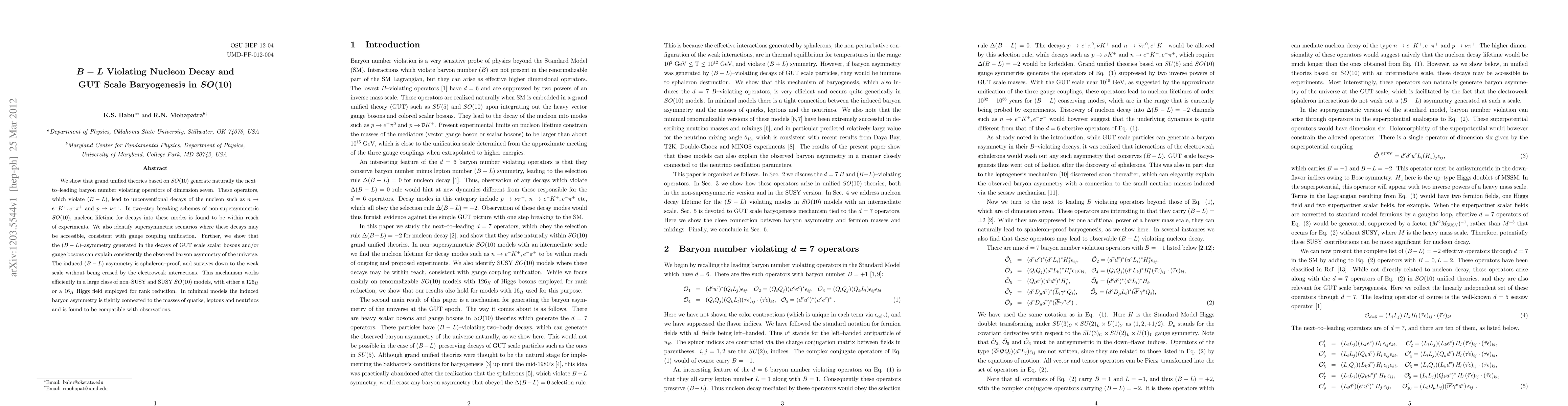 This paper explores B-L violating nucleon decay mechanisms in SO(10) grand unified theories, revealing next-to-leading dimension seven operators that enable unconventional nucleon decays. It also demonstrates how GUT scale processes can generate a (B-L)-asymmetry that explains the observed baryon asymmetry of the universe, consistent with experimental and observational constraints.