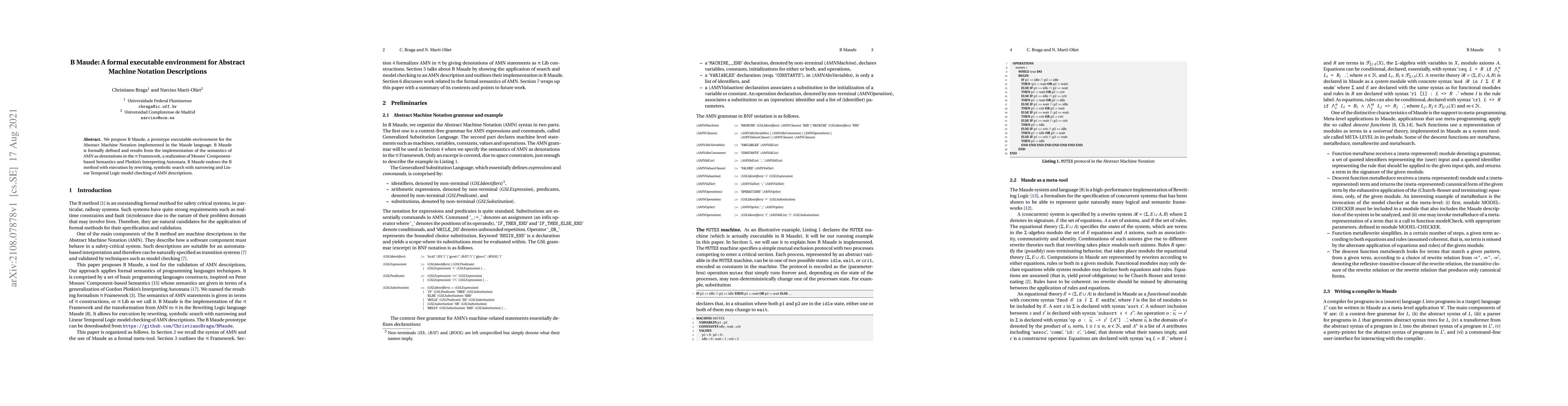 B Maude is an executable environment for Abstract Machine Notation (AMN) implemented in the Maude language, providing formal semantics through the $\pi$ Framework and supporting execution by rewriting, symbolic search, and Linear Temporal Logic model checking.